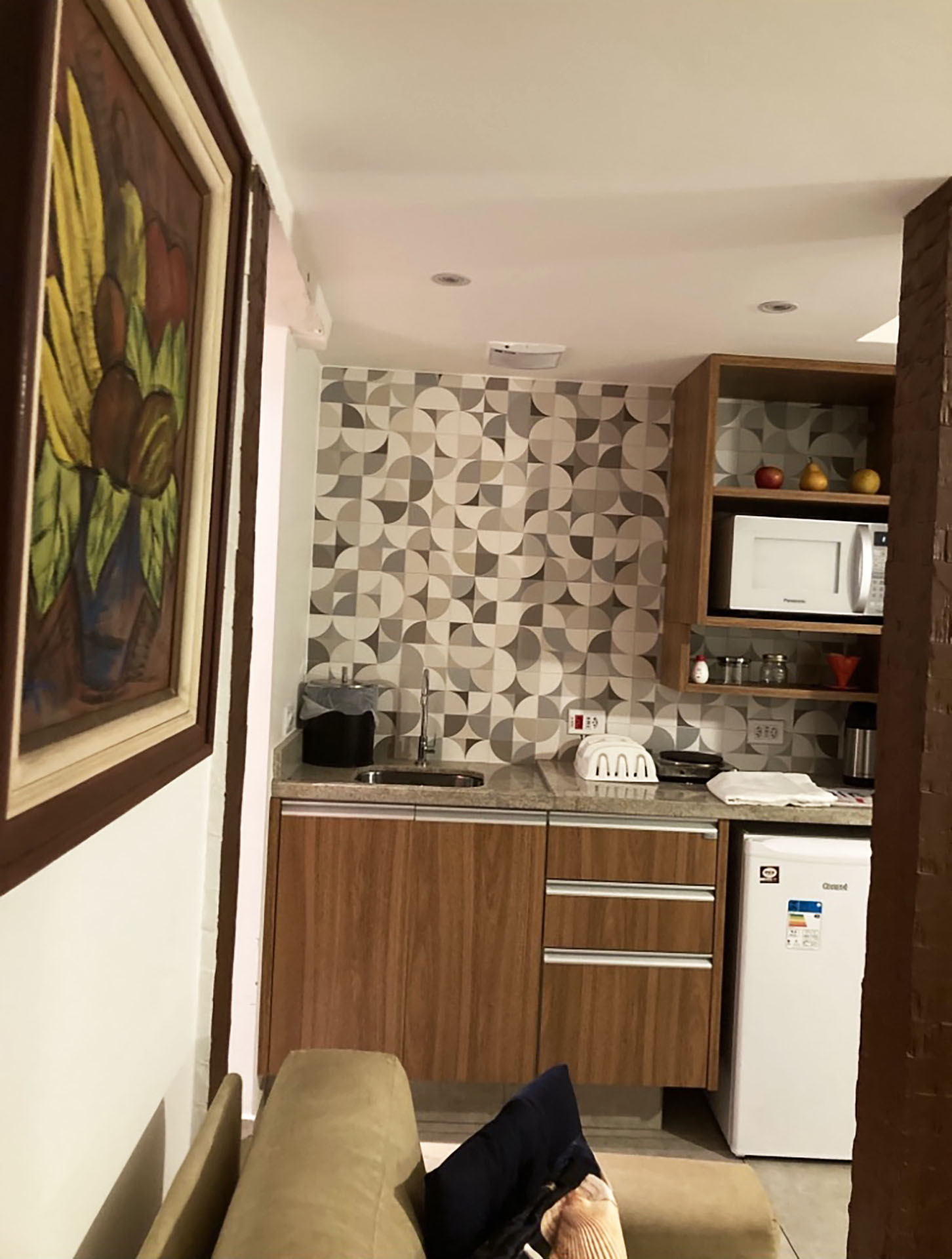 - A cozinha é simples, mas conta com todos os utensílios necessários para preparar suas refeições, incluindo fogão elétrico, frigobar, exaustor, micro-ondas e balcão