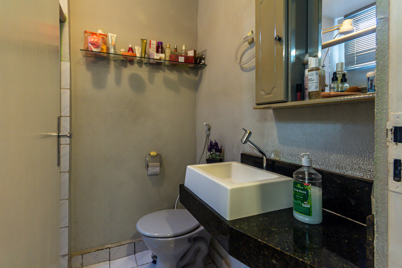 - O banheiro possui chuveiro elétrico, box de vidro/acrílico e secador de cabelo