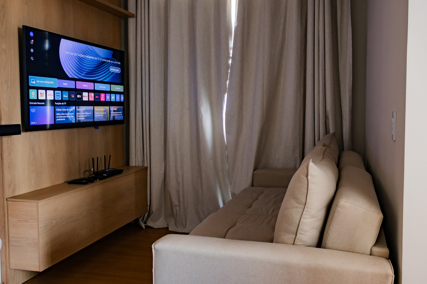 - A sala é bem confortável e nela você encontra cadeira, poltrona e sofá-cama
