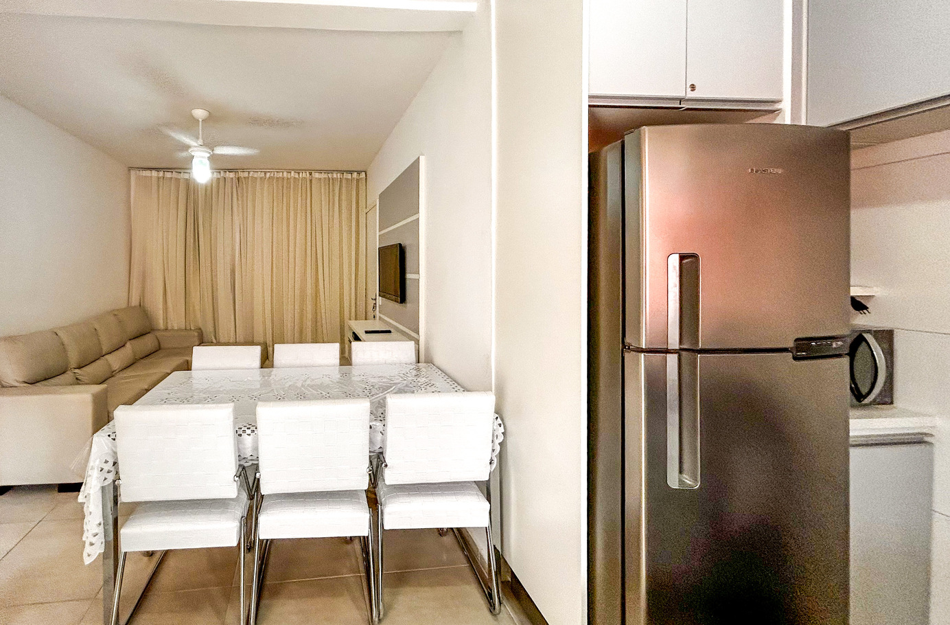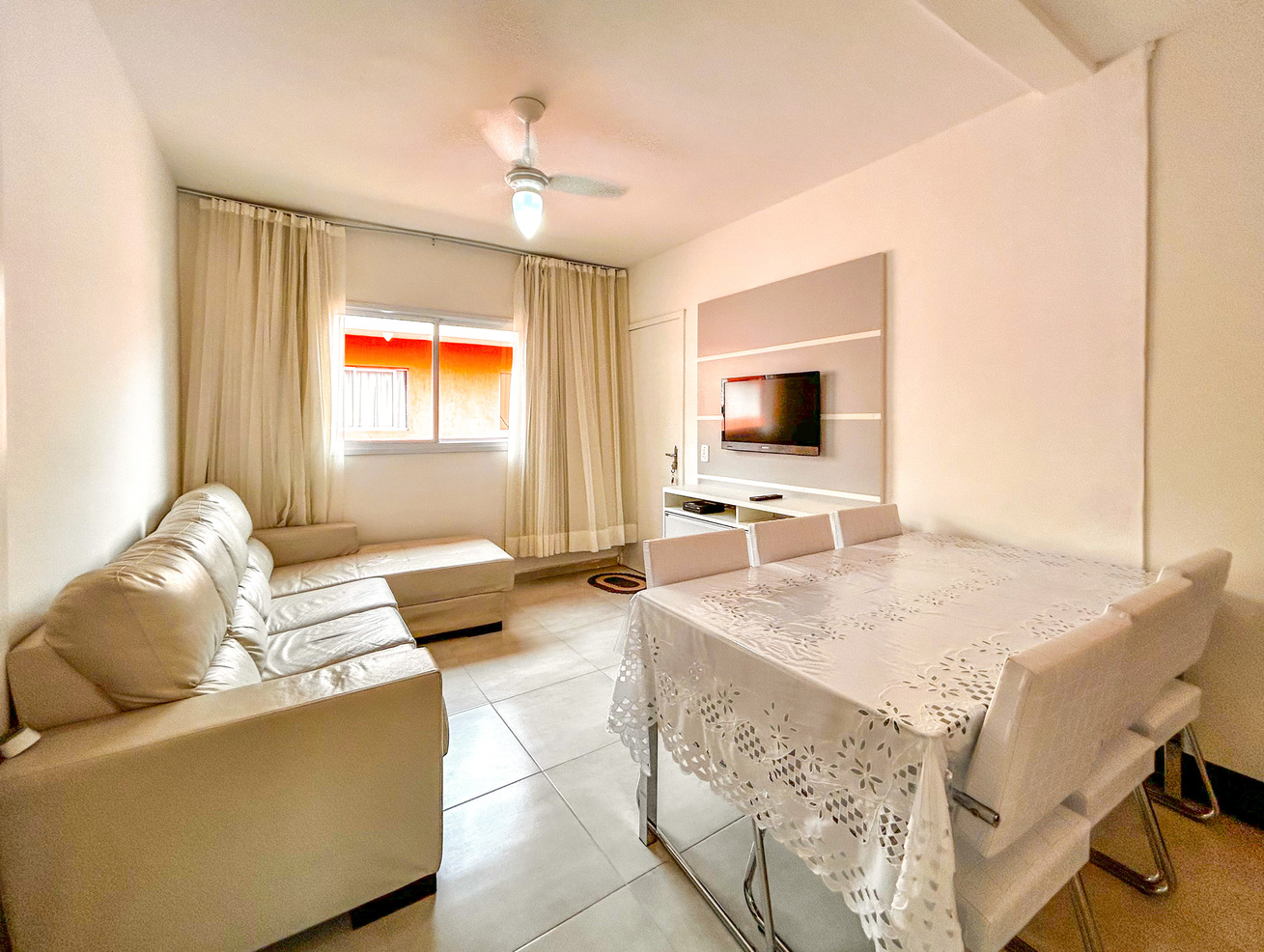 - A sala é bem confortável e nela você encontra sofá, TV e ventilador de teto