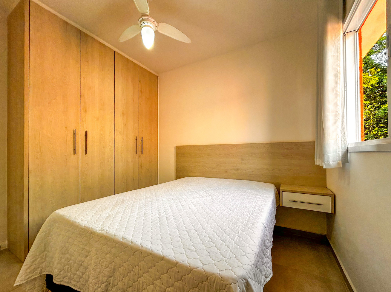 - Os dormitórios têm armário, protetor de colchão e ventilador de teto