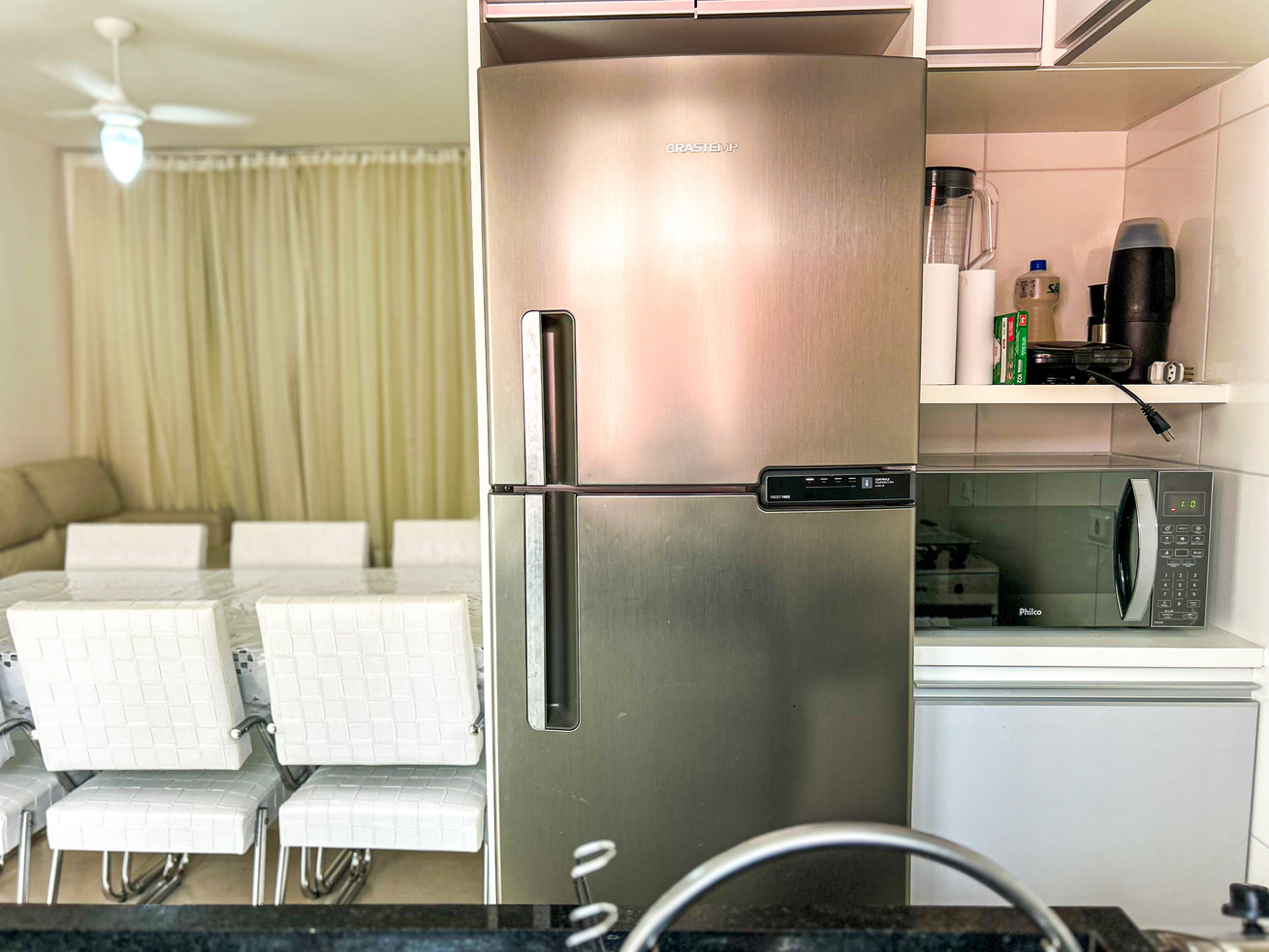 - Altamente equipada, a cozinha possui diversos utensílios, incluindo cafeteira, fogão, forno, geladeira frost free, liquidificador e micro-ondas (exceto sal, pimenta e óleo)