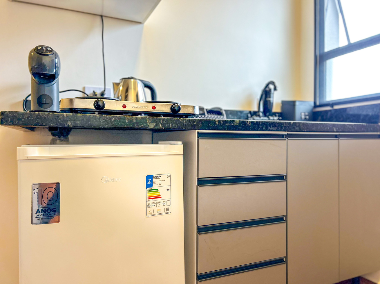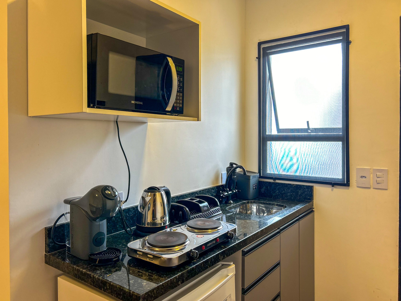 - A cozinha é equipada com todos os utensílios necessários para preparar ótimos pratos, incluindo cafeteira, fogão, geladeira, frigobar e micro-ondas, exceto sal, pimenta e óleo