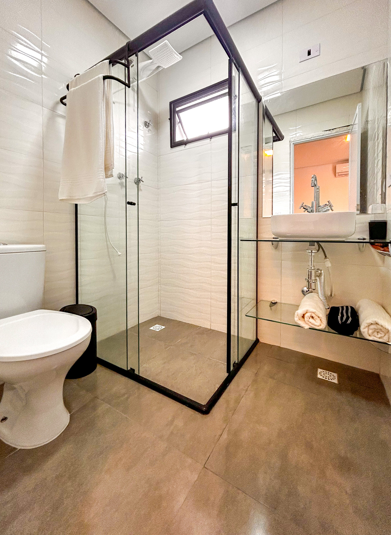 - A suíte é equipada com 1 bicama, 1 cama de casal, vista para o mar, armário, edredom / cobertor, protetor de colchão, TV LCD, chuveiro elétrico, box de vidro/acrílico e secador de cabelo