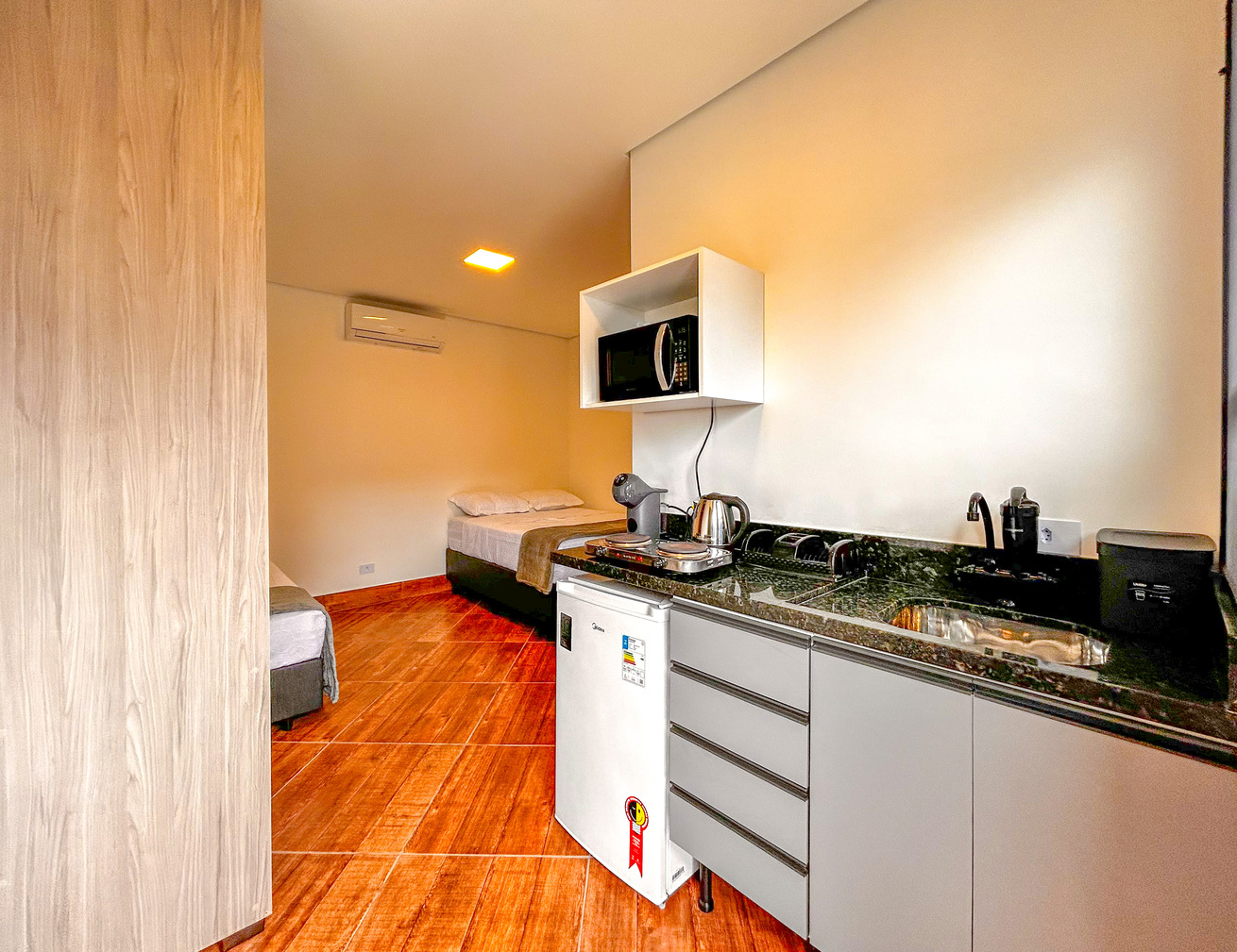 - A cozinha é equipada com todos os utensílios necessários para preparar ótimos pratos e (exceto sal, pimenta e óleo) incluindo cafeteira, fogão, geladeira, frigobar, liquidificador, Air Fryer micro-ondas e cafeteira Dolce Gusto (necessário trazer as suas cápsulas para utilizar)