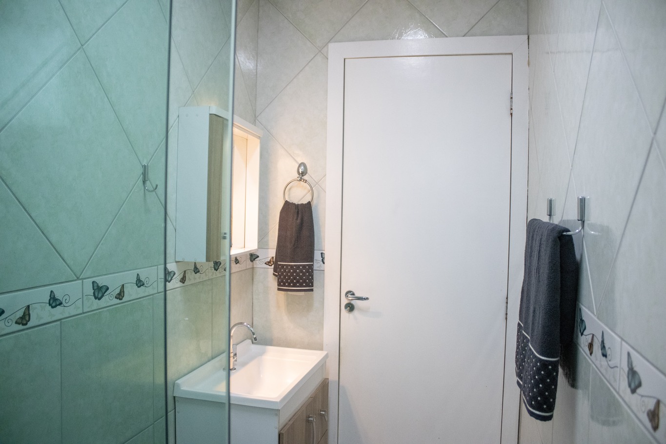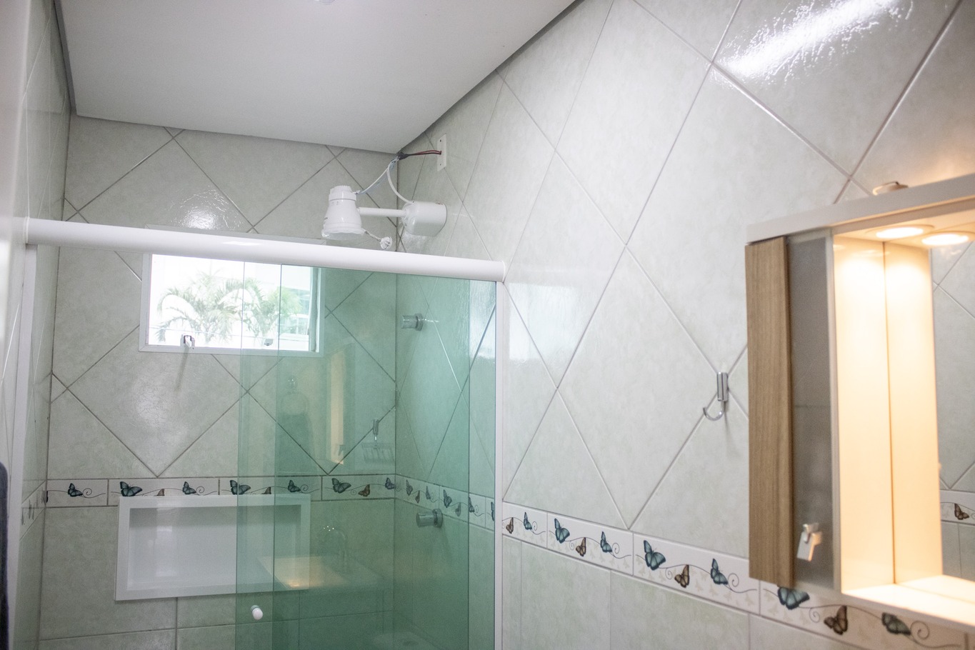 - O banheiro tem chuveiro elétrico e box de vidro/acrílico