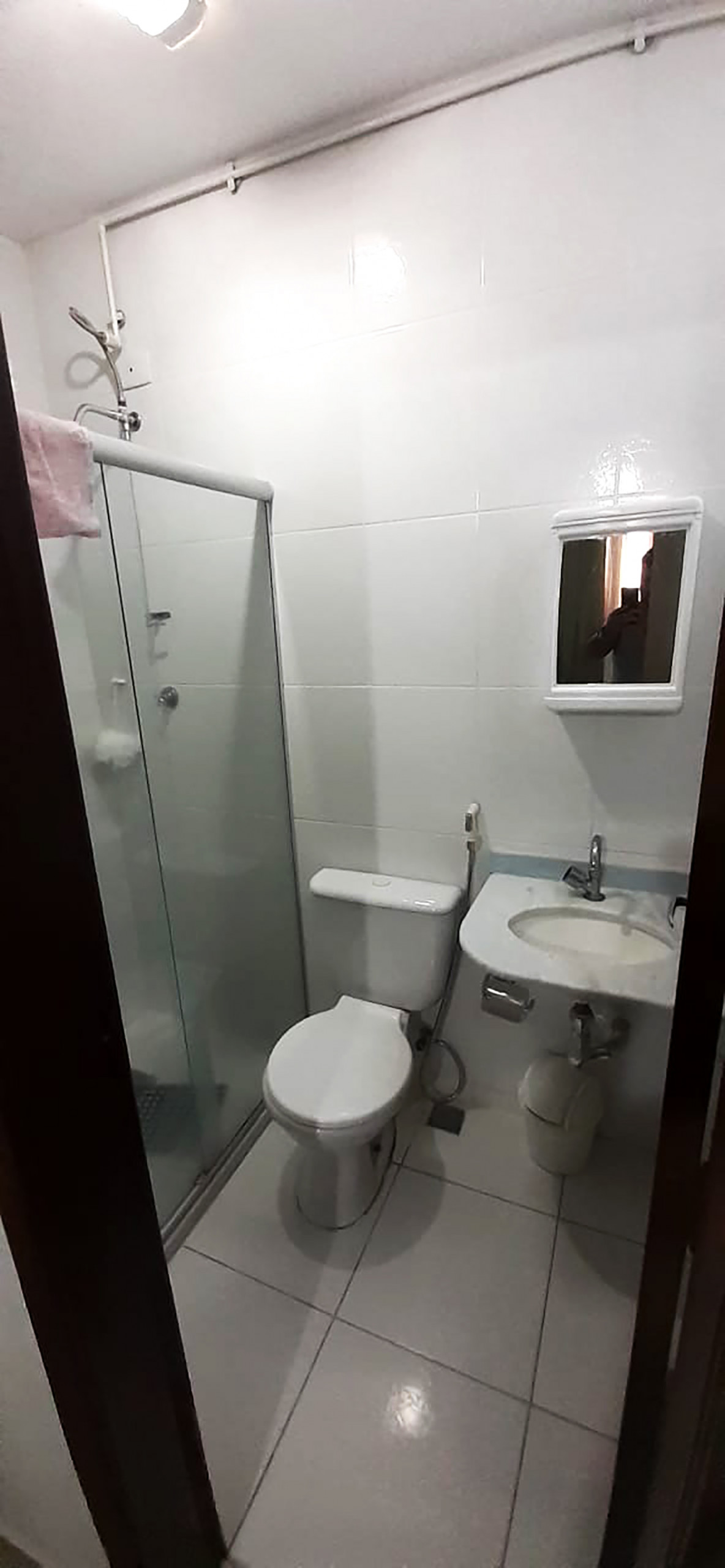 O outro banheiro da casa também tem chuveiro a gás, box de vidro/acrílico e espelho.
