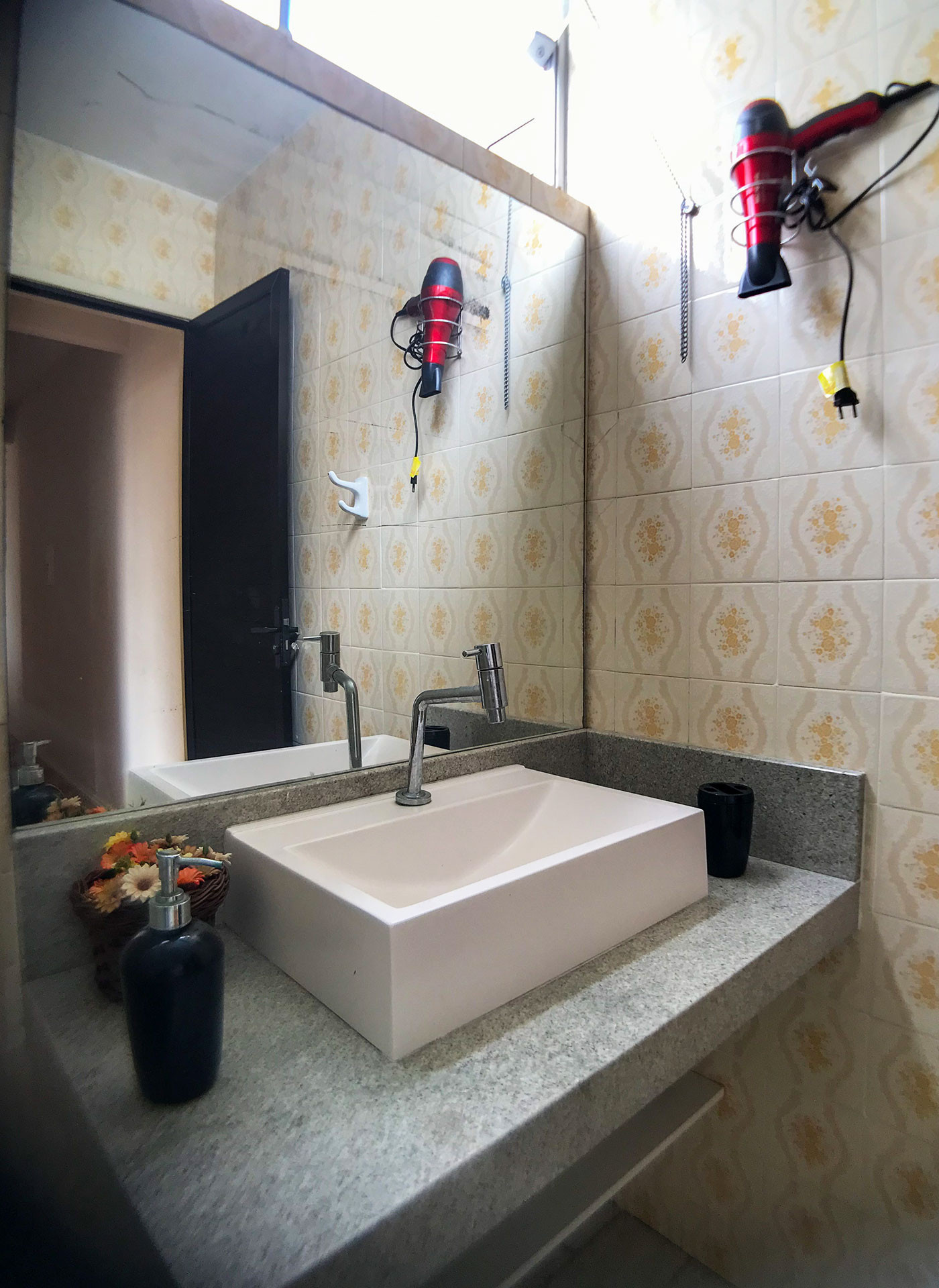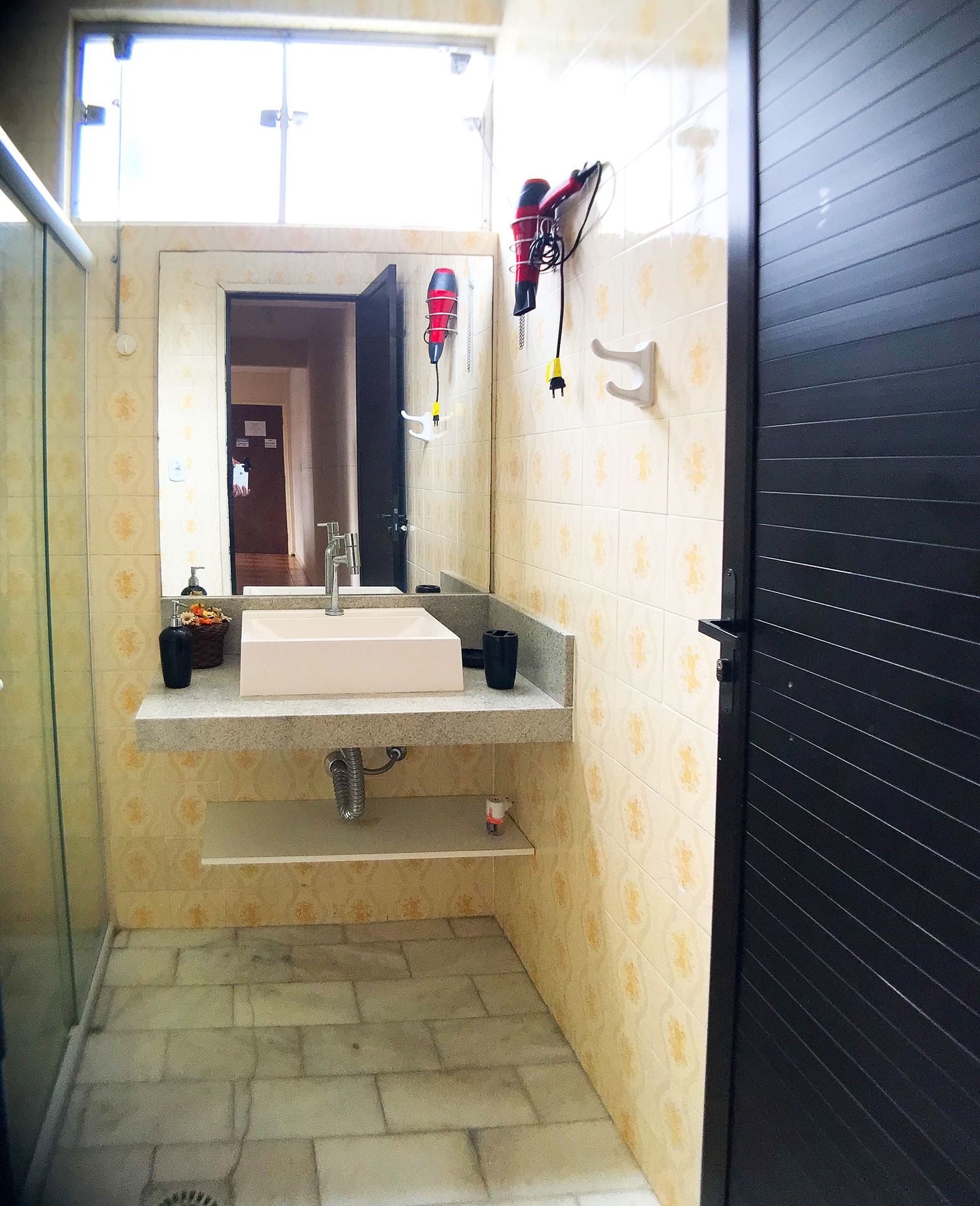 - Banheiro equipado com chuveiro elétrico, box de vidro e secador de cabelo