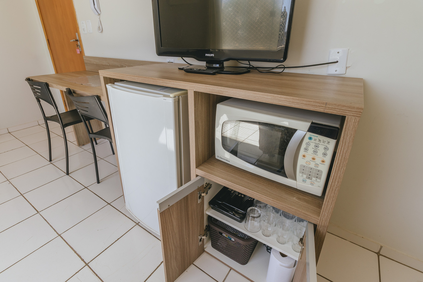 - Cozinha Compacta e Equipada com frigobar (geladeira), microondas e utensílios diversos(exceto óleo e sal)