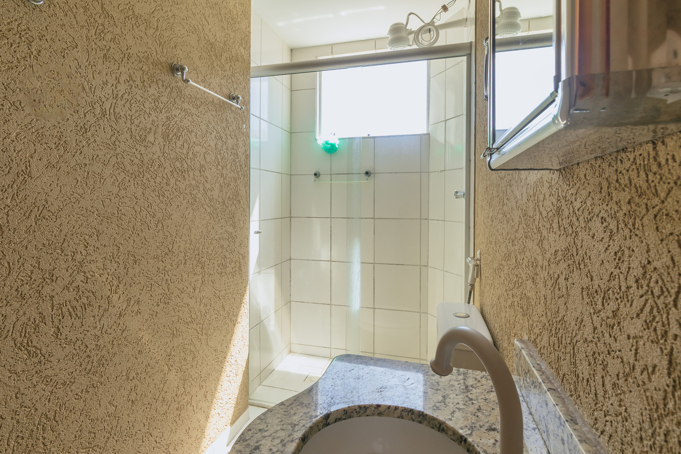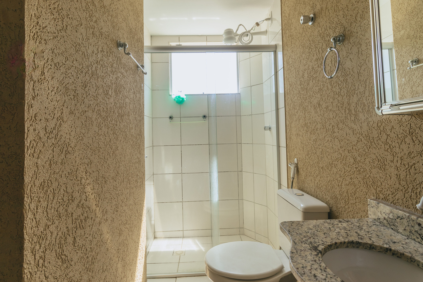- Banheiro equipado com chuveiro elétrico e box de vidro/acrílico, além de um varal portátil para maior conveniência.
