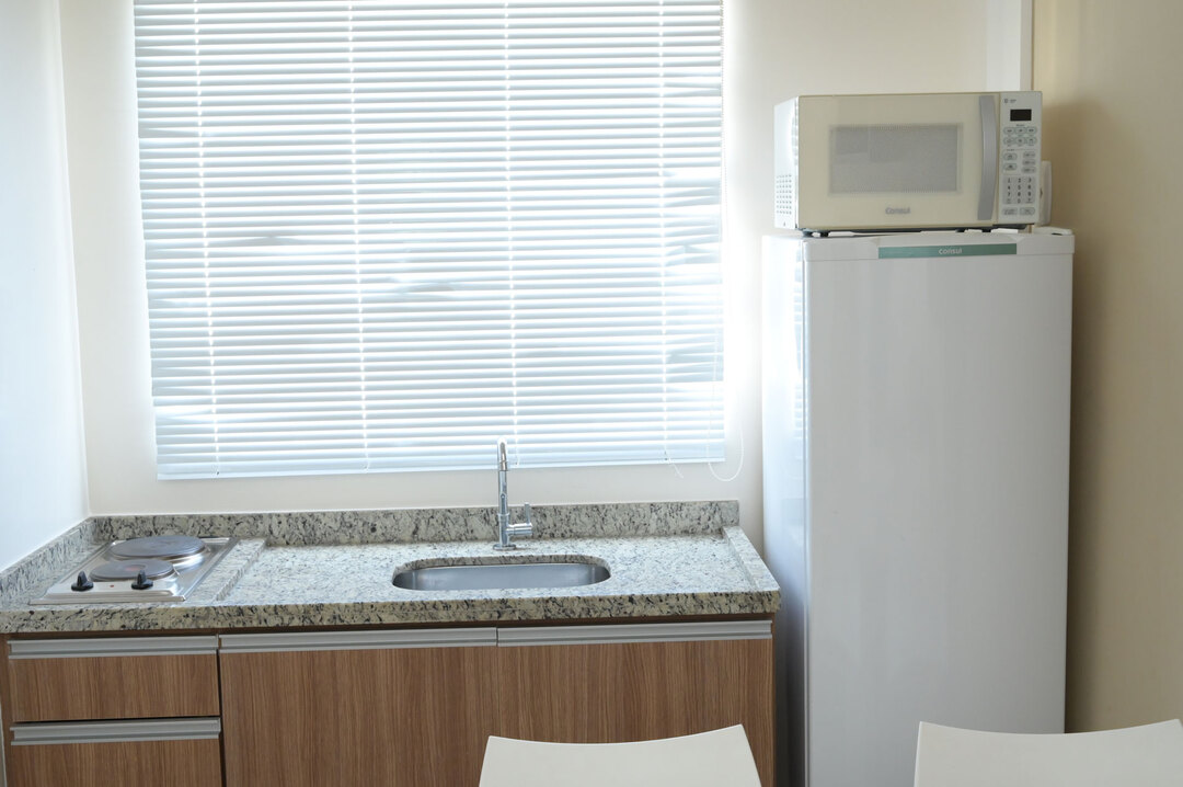 - A cozinha é compacta porém totalmente equipada com diversos utensílios para preparar suas refeições, incluindo cafeteira, fogão, forno, geladeira, micro-ondas e exaustor