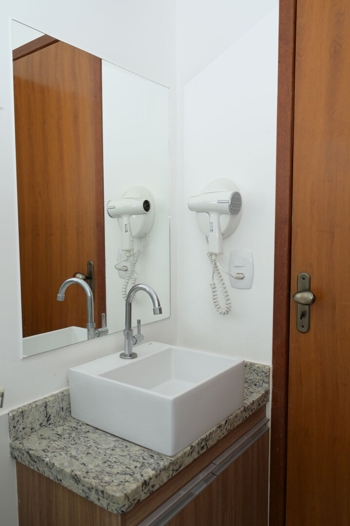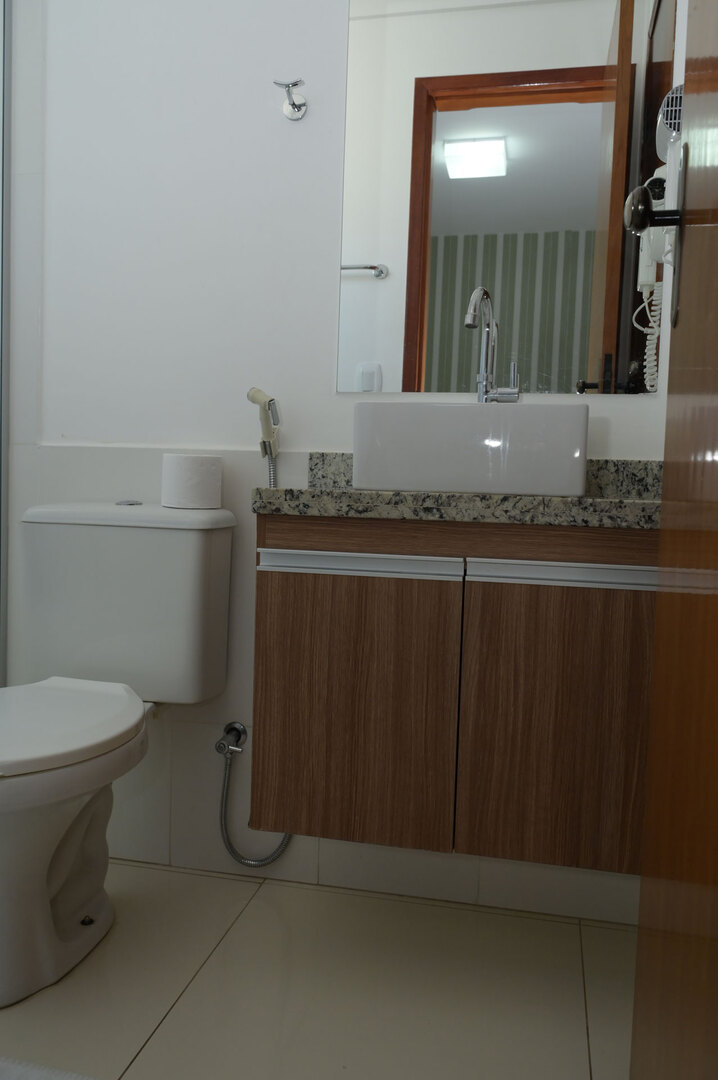 - Banheiro equipado com chuveiro elétrico e box de vidro/acrílico
