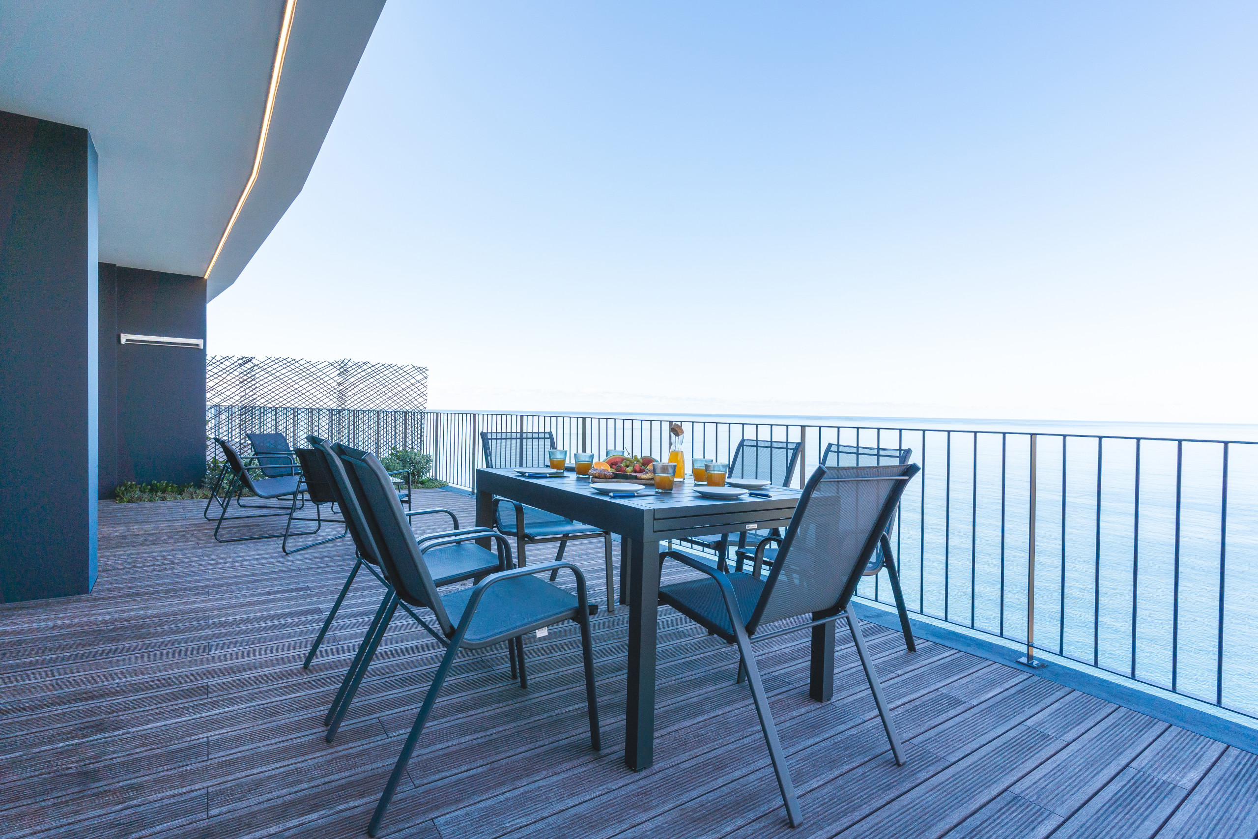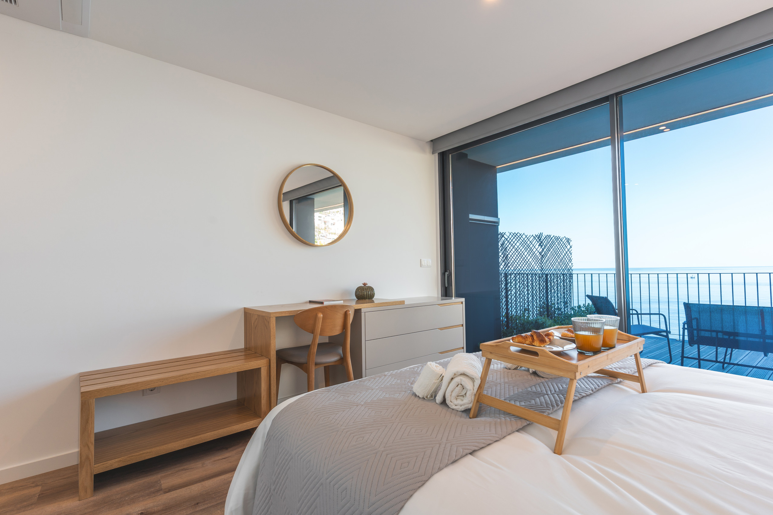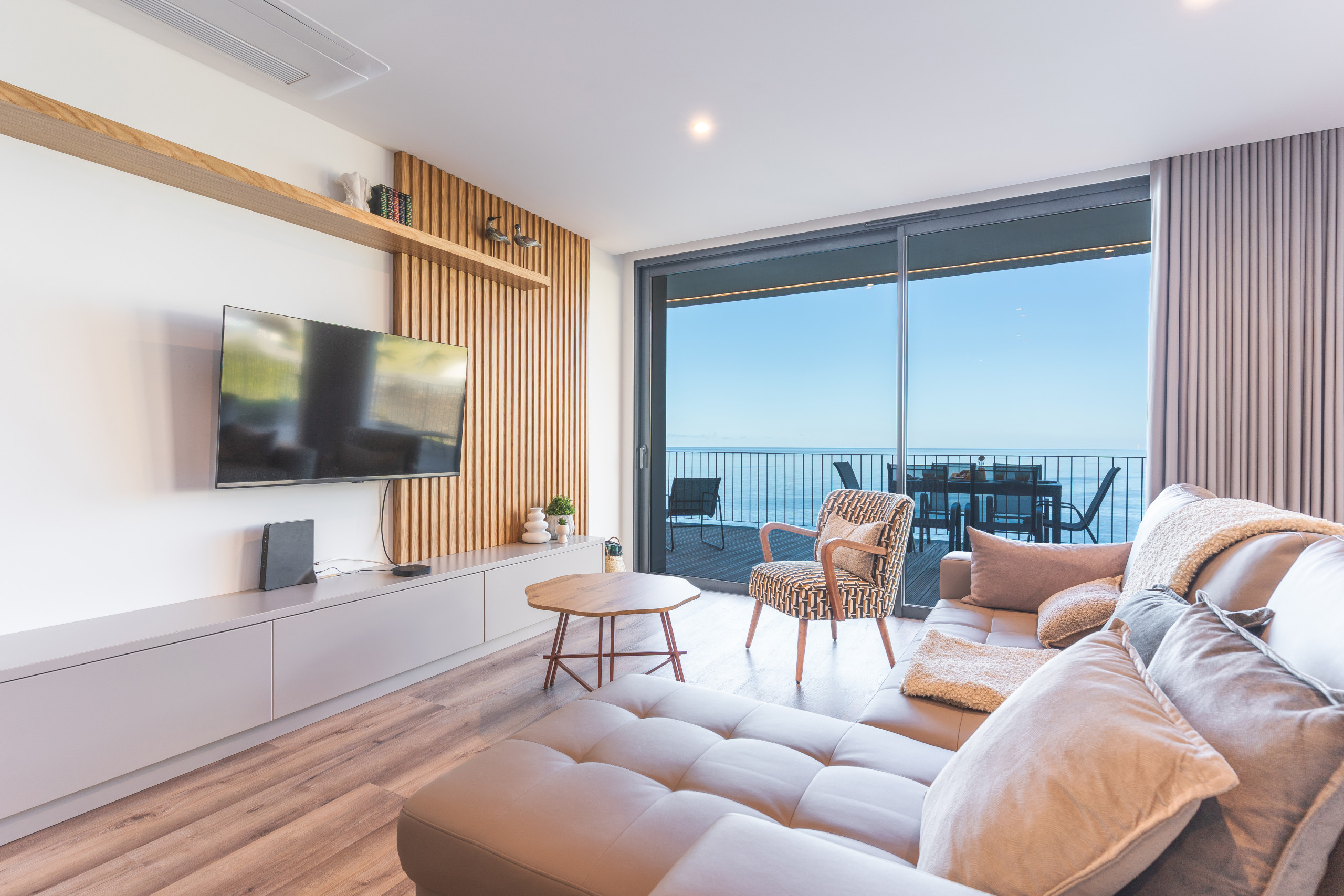 Acomodação de 90 m² acolhedor e moderno, com vistas para o mar e piscina.