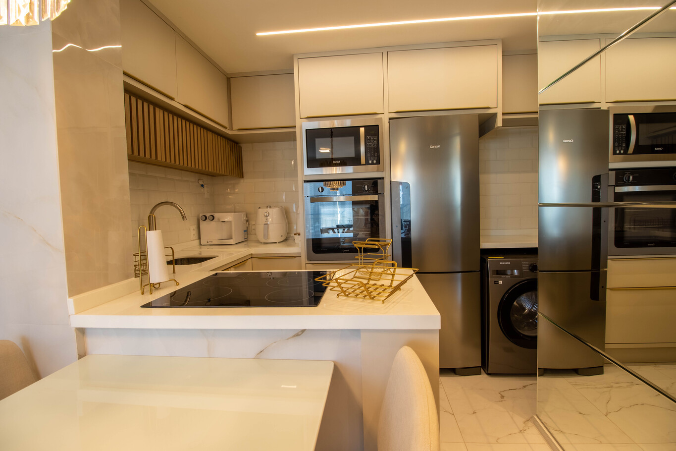 - A cozinha é equipada com fogão elétrico, forno, geladeira, airfryer, liquidificador e micro-ondas (exceto sal, pimenta e óleo)