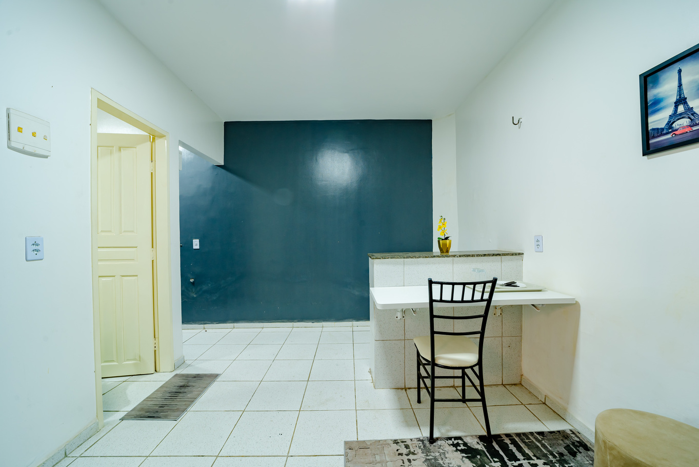 - Sala com puffs e bancada multifuncional para refeições e trabalho