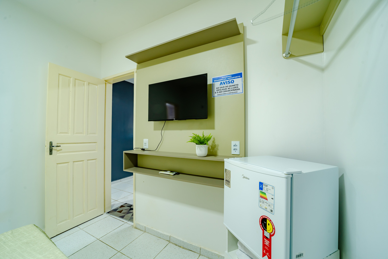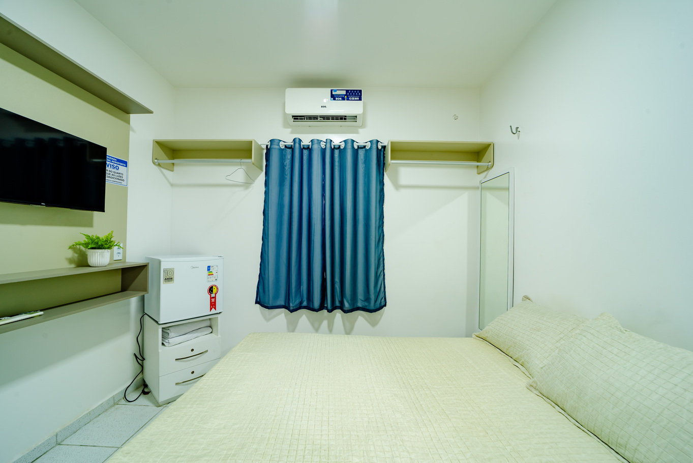 - Quarto com cama de casal, frigobar, ar-condicionado e Smart TV para seu entretenimento