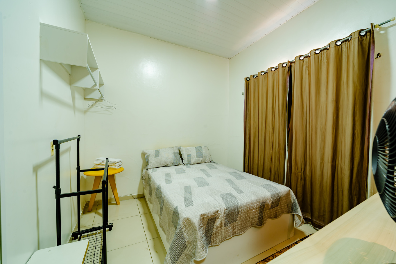 - Quarto com cama de casal, ar-condicionado, ventilador portátil e Smart TV para seu entretenimento