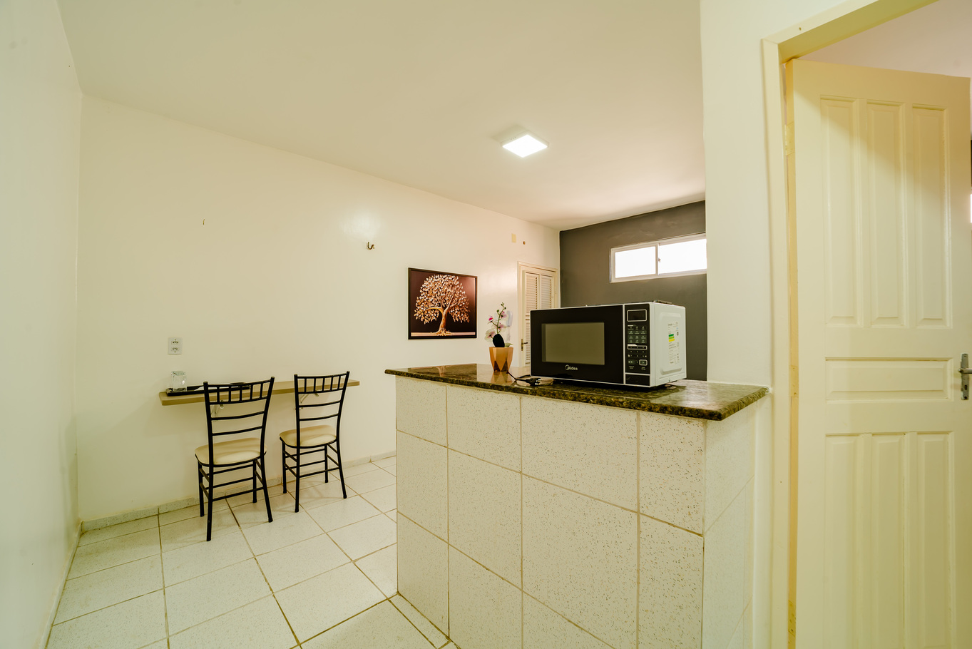 - Cozinha compacta com microondas, pia, pratos, copos e talheres. Não disponibilizamos óleo e sal