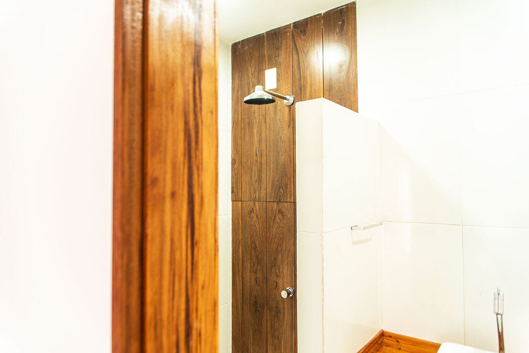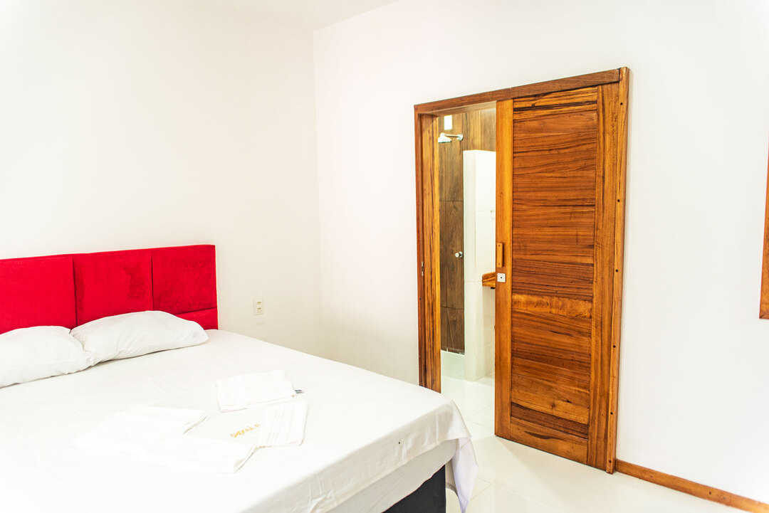 - Na suíte há 1 cama queen size, 1 cama de solteiro, frigobar, armário, chuveiro elétrico e box de revestimento