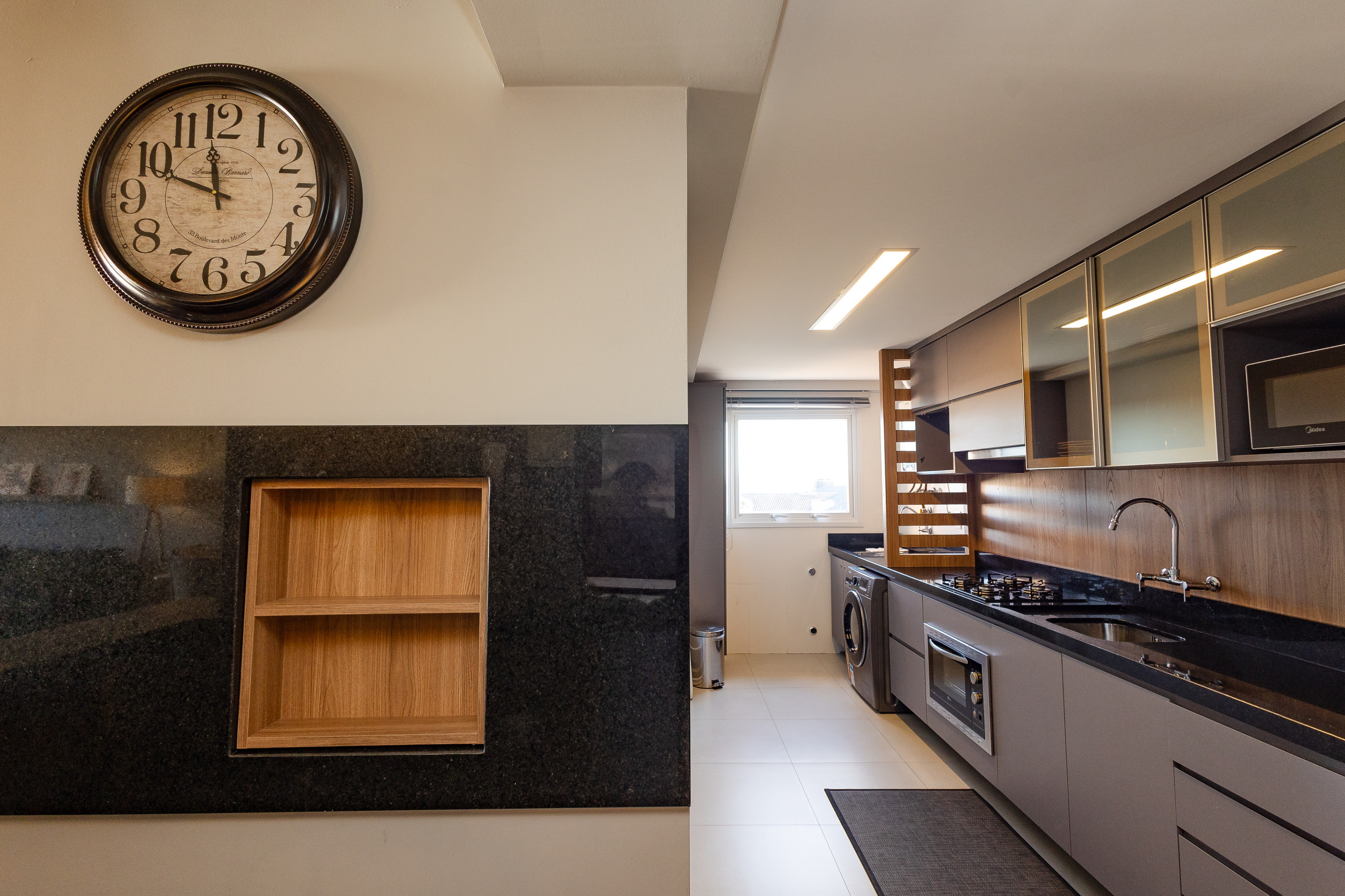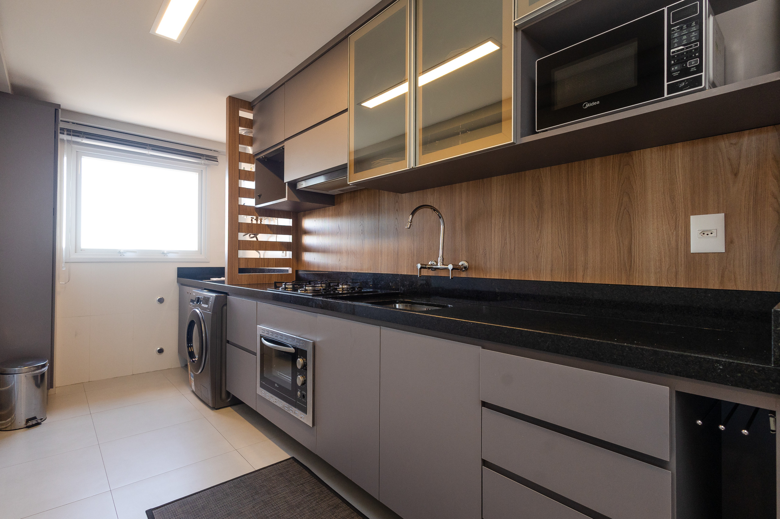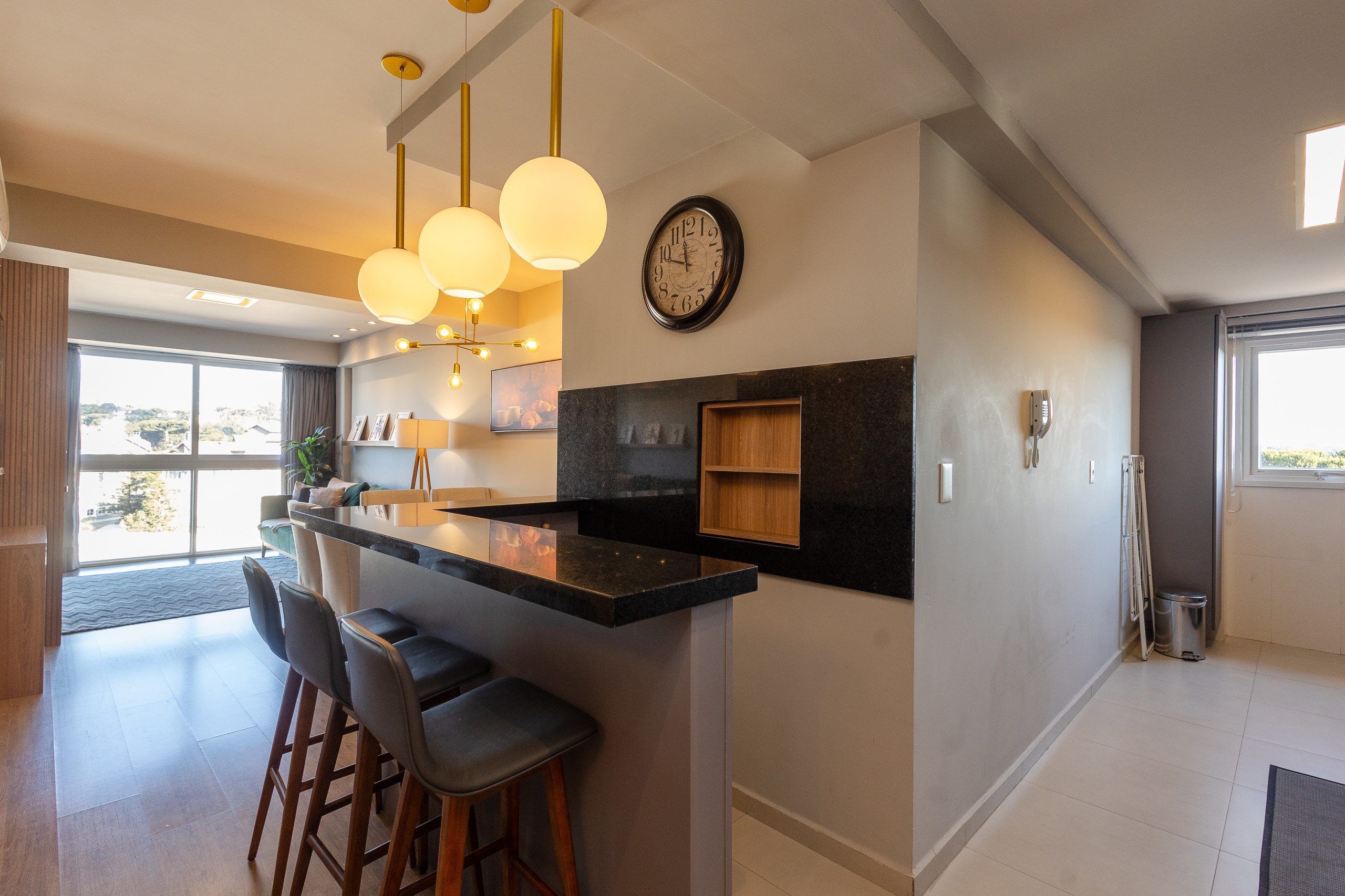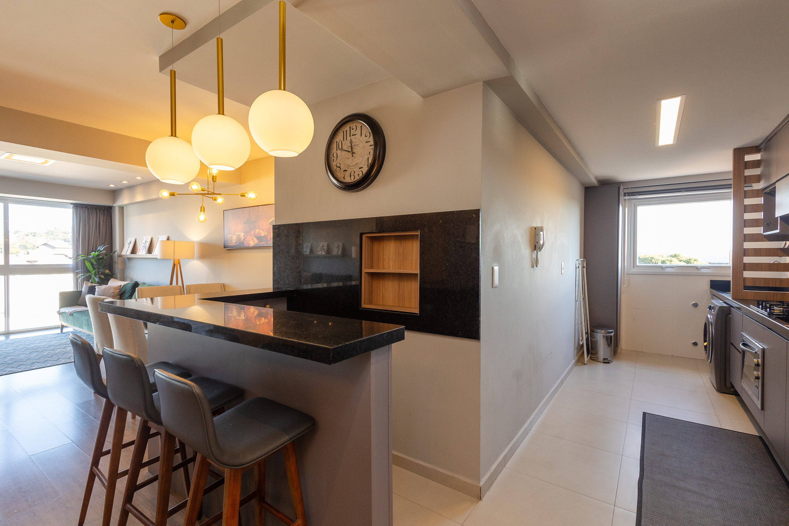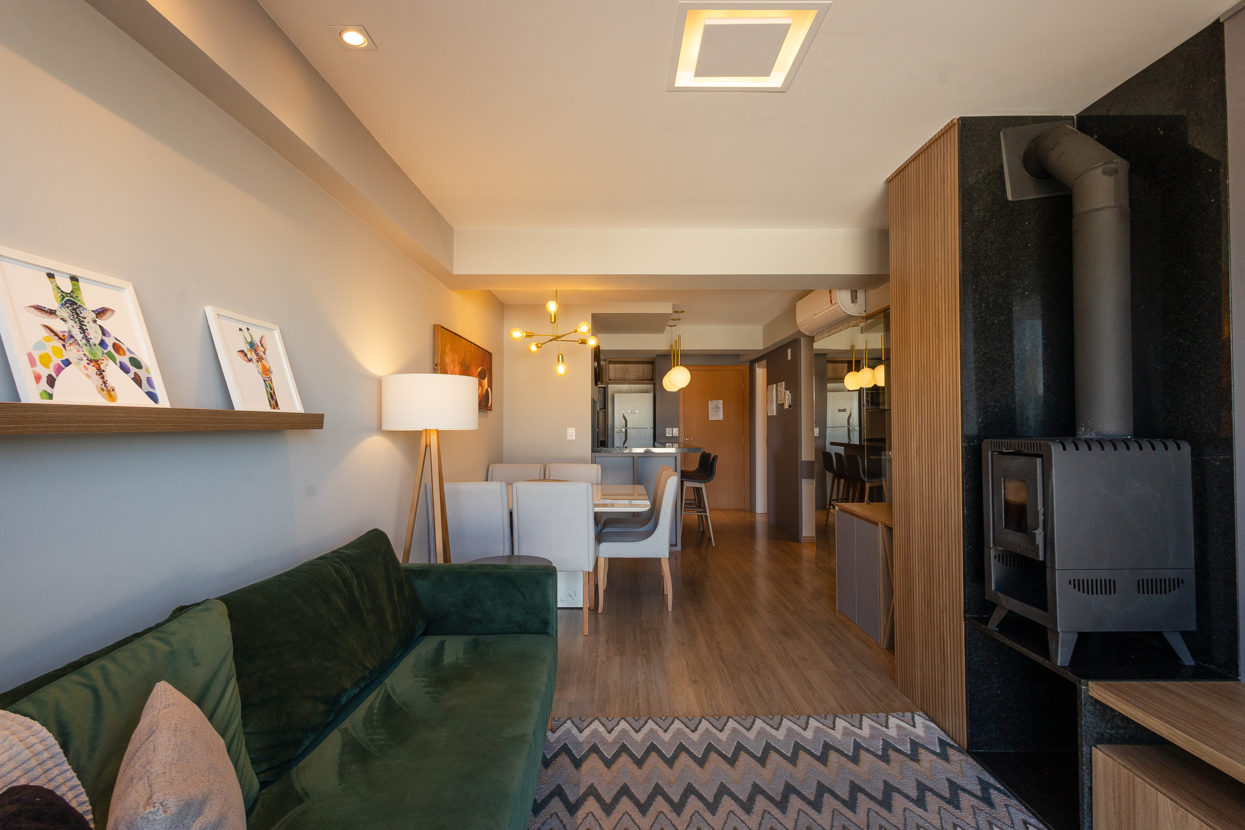 Apartamento moderno, decorado com muito bom gosto e cuidado, possui living 2 ambientes integrados e com lareira, cozinha completa,