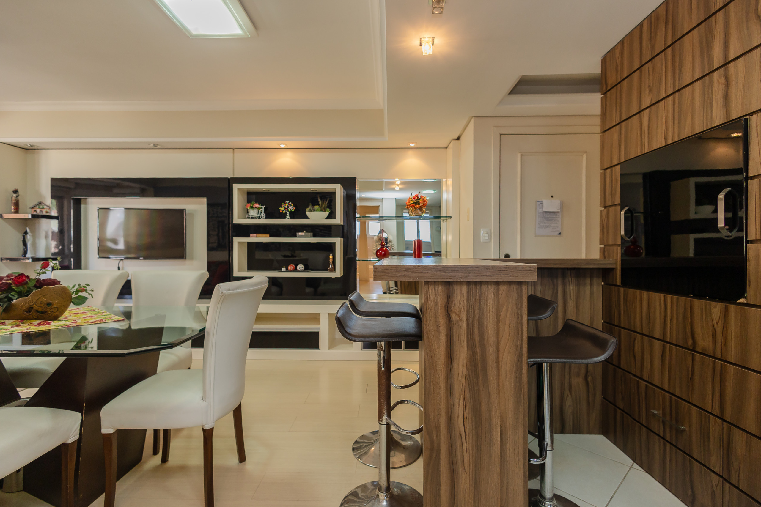 Apartamento moderno com 2 quartos, sendo uma suíte, amplo living de estar e jantar integrados à cozinha (completamente equipada) e área gourmet com churrasqueira. Ainda conta com área de serviço com máquina de lavar roupa, banheiro social completo, 1 vaga de garagem e enxoval completo de cama e banho para todos durante a estadia. Localizado em uma das principais avenidas da cidade, está a aproximadamente 1km da rua coberta, e você encontrará o melhor da vida aqui sem precisar tirar o carro da garagem.