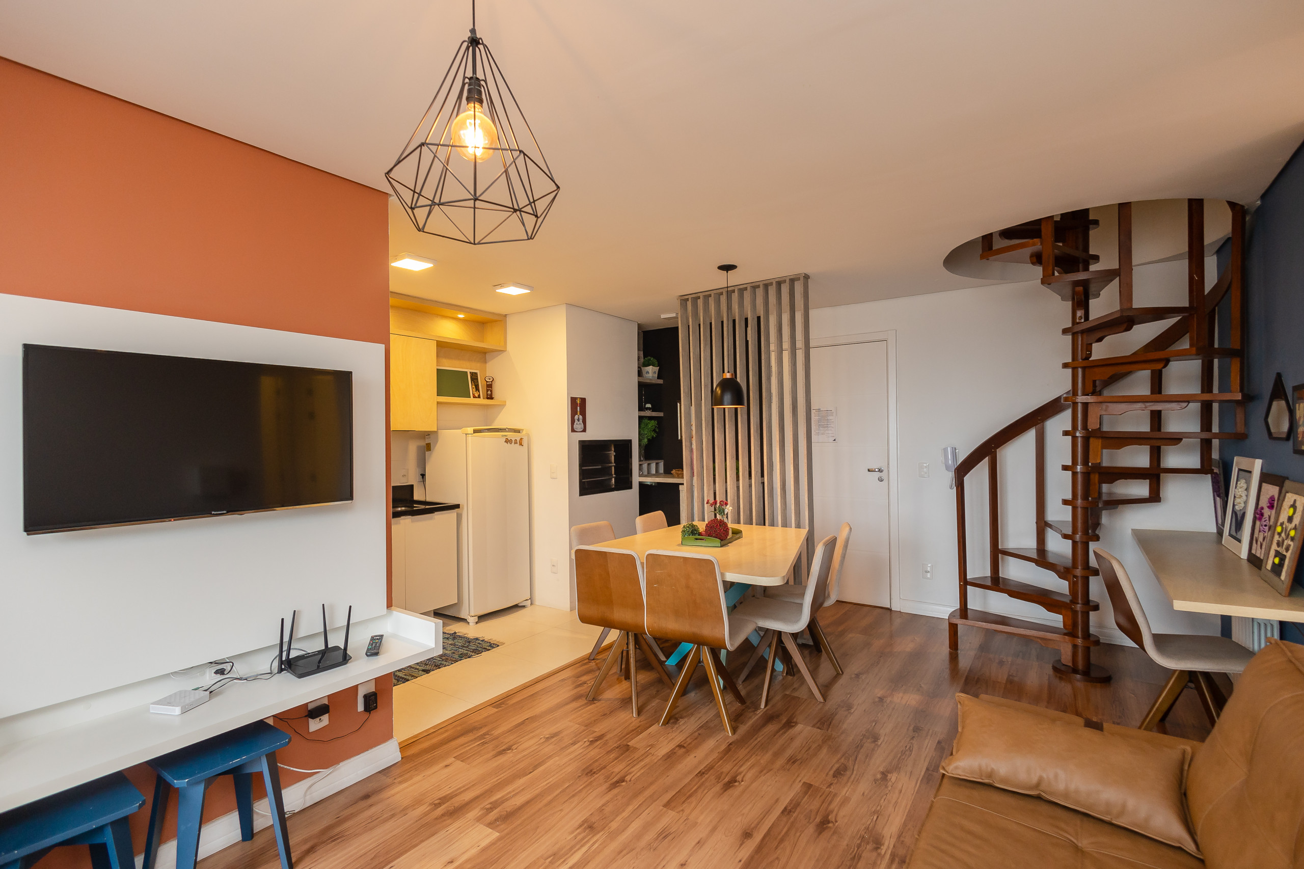 A cozinha americana completamente equipada é um destaque, com geladeira, freezer, máquina de lavar, secadora, máquina de café, forno, lava-louças, microondas, torradeira, liquidificador e todos os utensílios necessários para preparar refeições deliciosas. Para momentos de descontração, a acomodação conta com churrasqueira e lareira, perfeitas para noites aconchegantes.