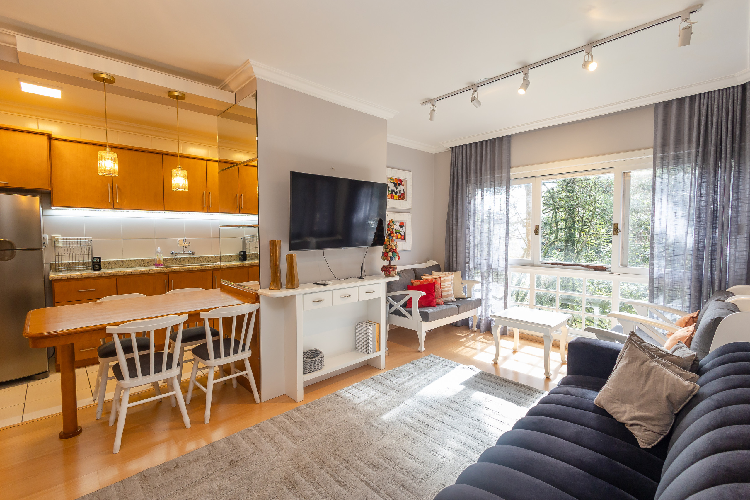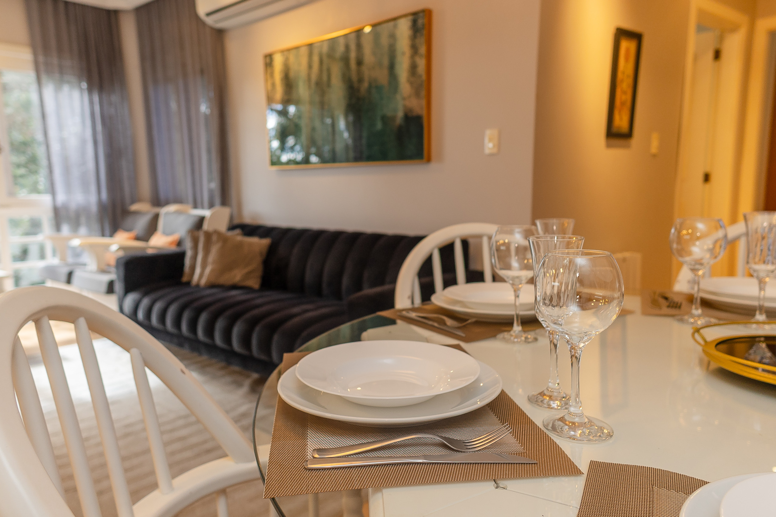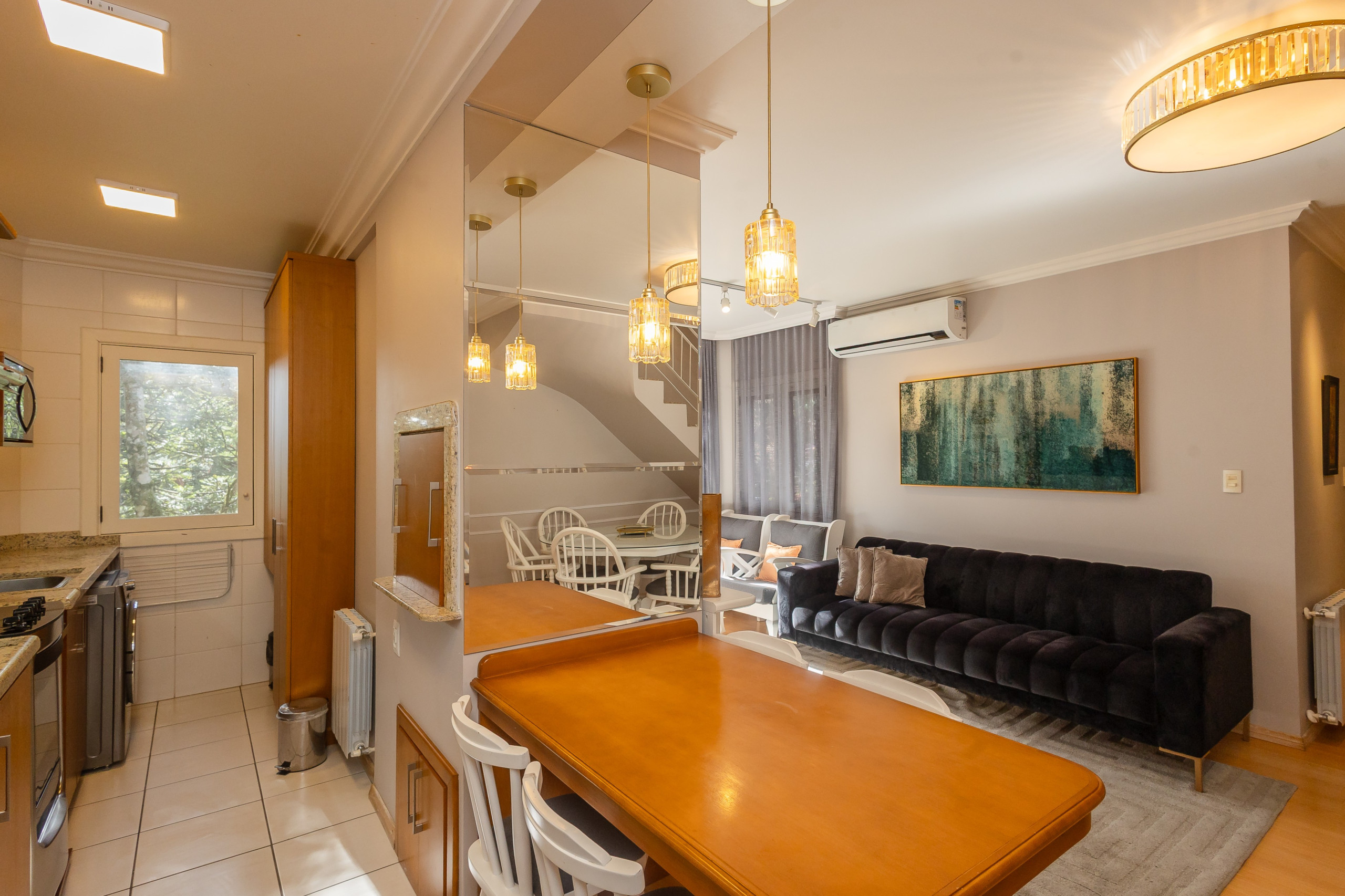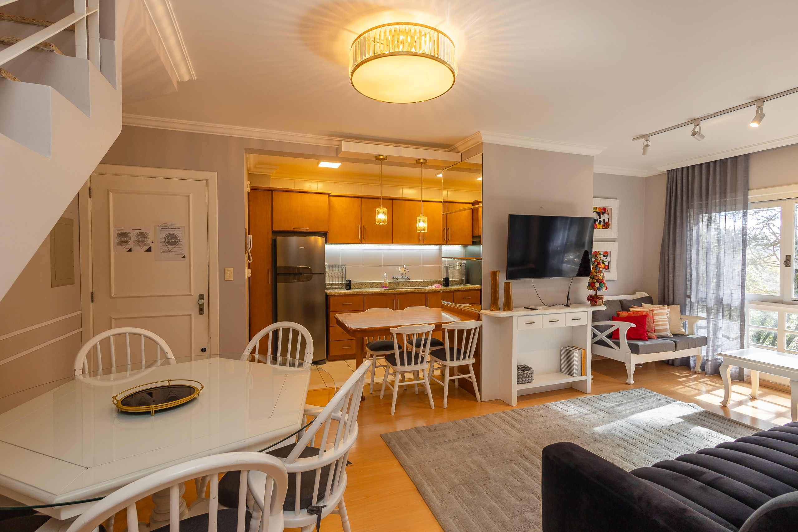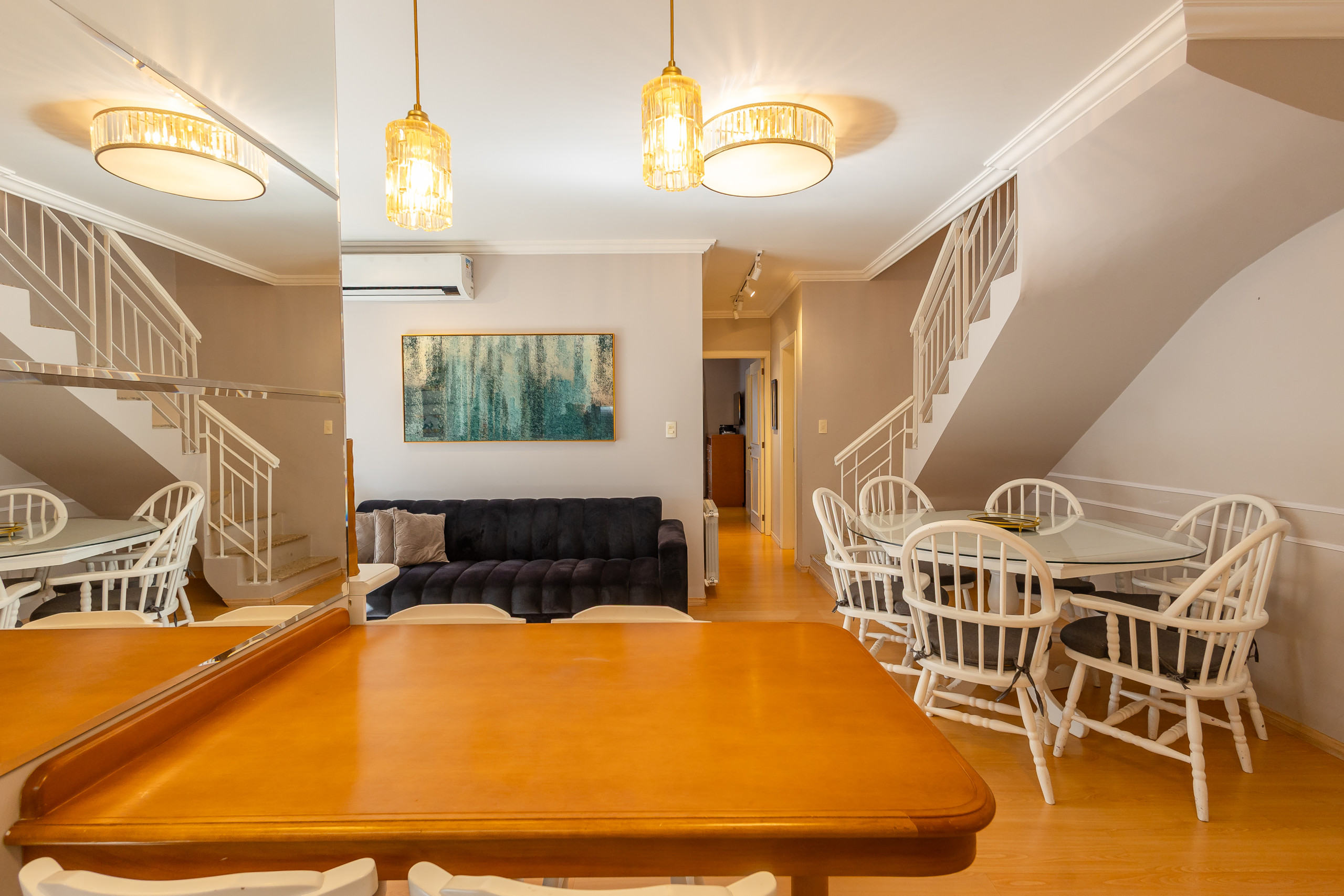 Belíssima cobertura duplex com amplo living integrado ao jantar e à cozinha americana completa com churrasqueira, área de serviço com lava/seca. Possui 5 dormitórios, sendo 3 suítes, e dois banheiros completos. Dispõe smart TVs e split Q/F em todos os cômodos, e duas vagas de garagem. Localizado a cerca de 800m da Rua Coberta e rodeado por restaurantes, lojas, supermercado, farmácia, etc, permite que você aproveite as facilidades e delícias que a cidade oferece em pequenas caminhadas, deixando os carros na garagem!