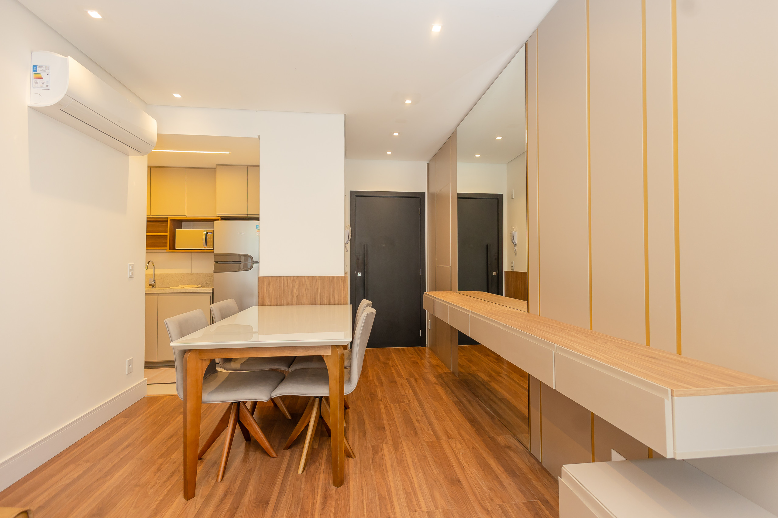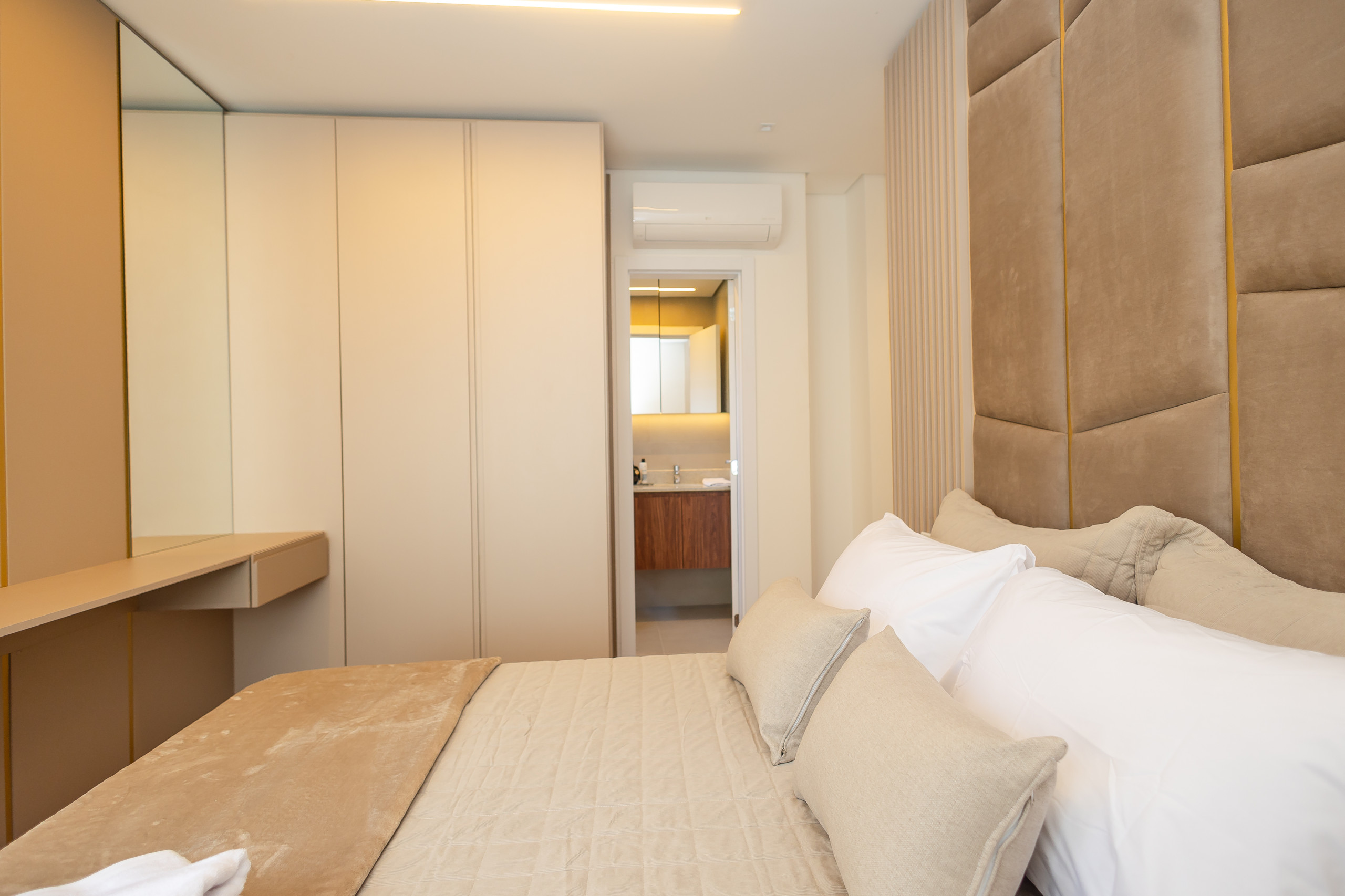 A cozinha independente é completamente equipada com geladeira, freezer, forno, micro-ondas, máquina de café, chaleira, sanduicheira e todos os utensílios necessários para preparar refeições deliciosas. Ideal para quem gosta de cozinhar e aproveitar momentos em família. O ar-condicionado em todos os ambientes garante conforto térmico, independentemente da época do ano.