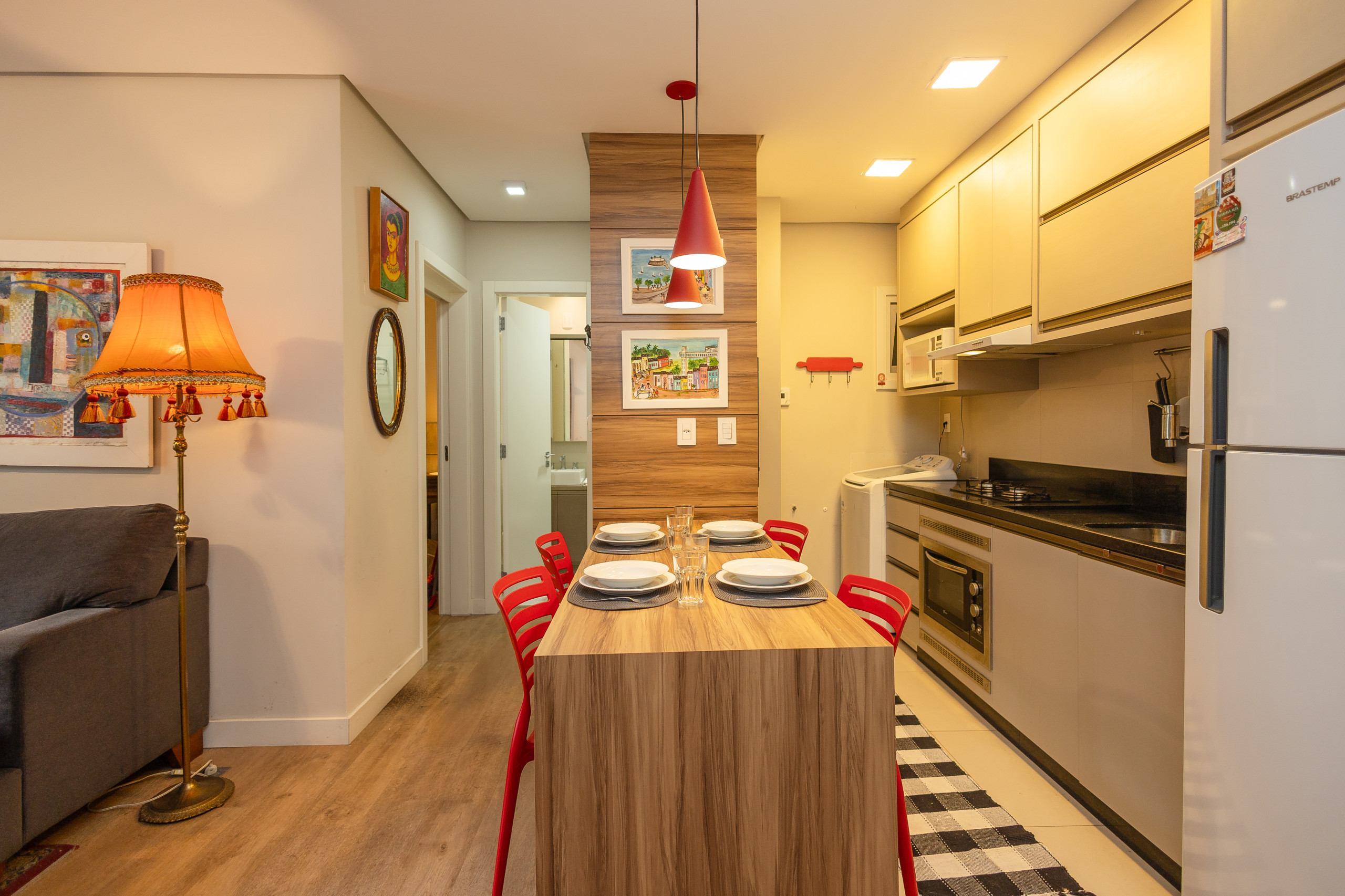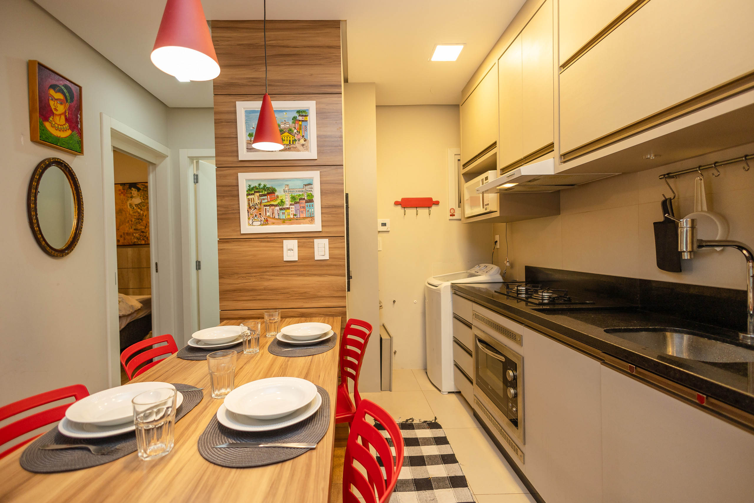 A cozinha completa conta churrasqueira, geladeira, cafeteira, sanduicheira, micro-ondas, cooktop e fogão. À mesa, poderão sentar-se até 04 hóspedes para refeições ou para simplesmente apreciar um chocolate quente ou um vinho. O apartamento ainda dispõe de secador de cabelos.