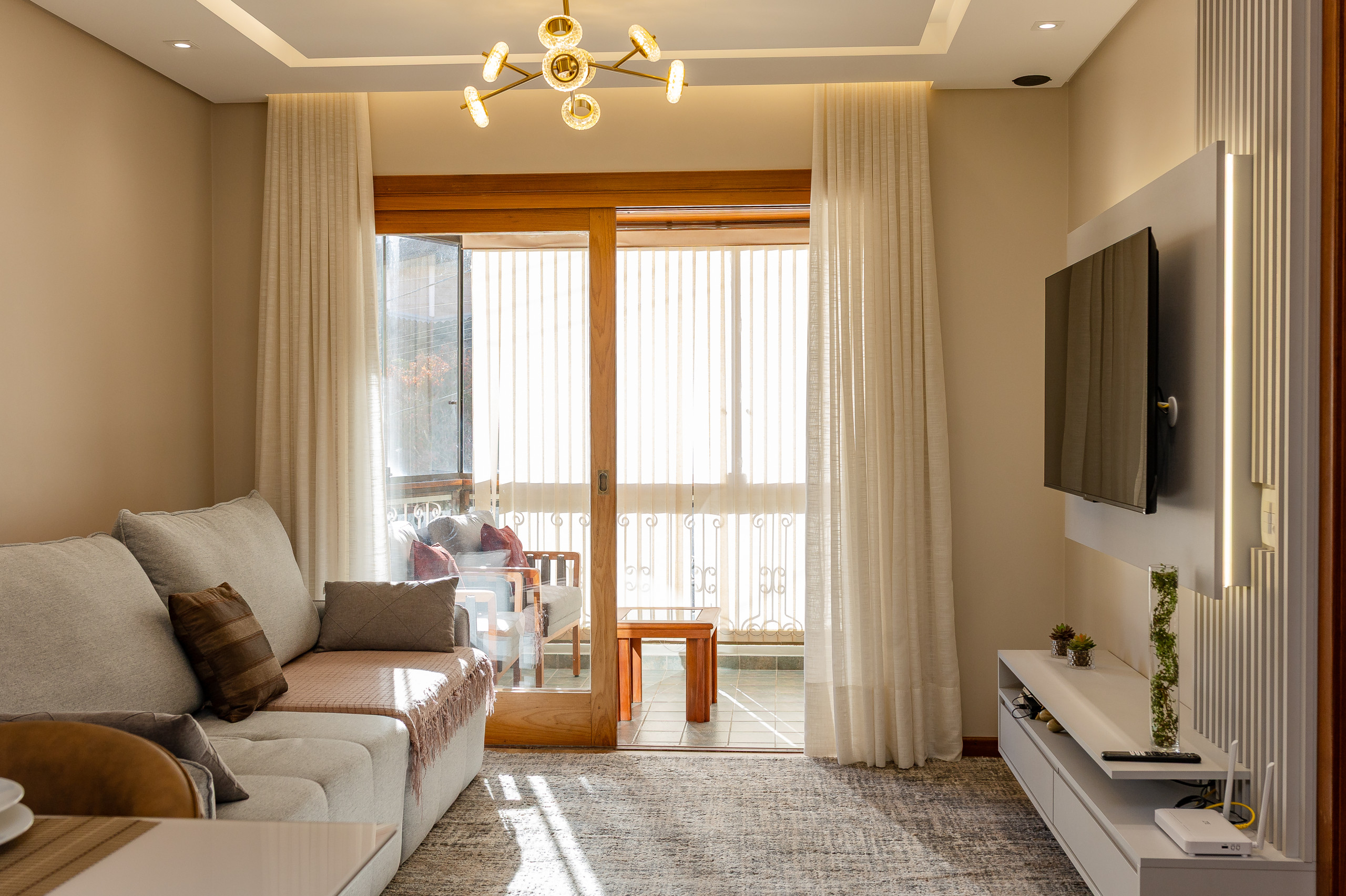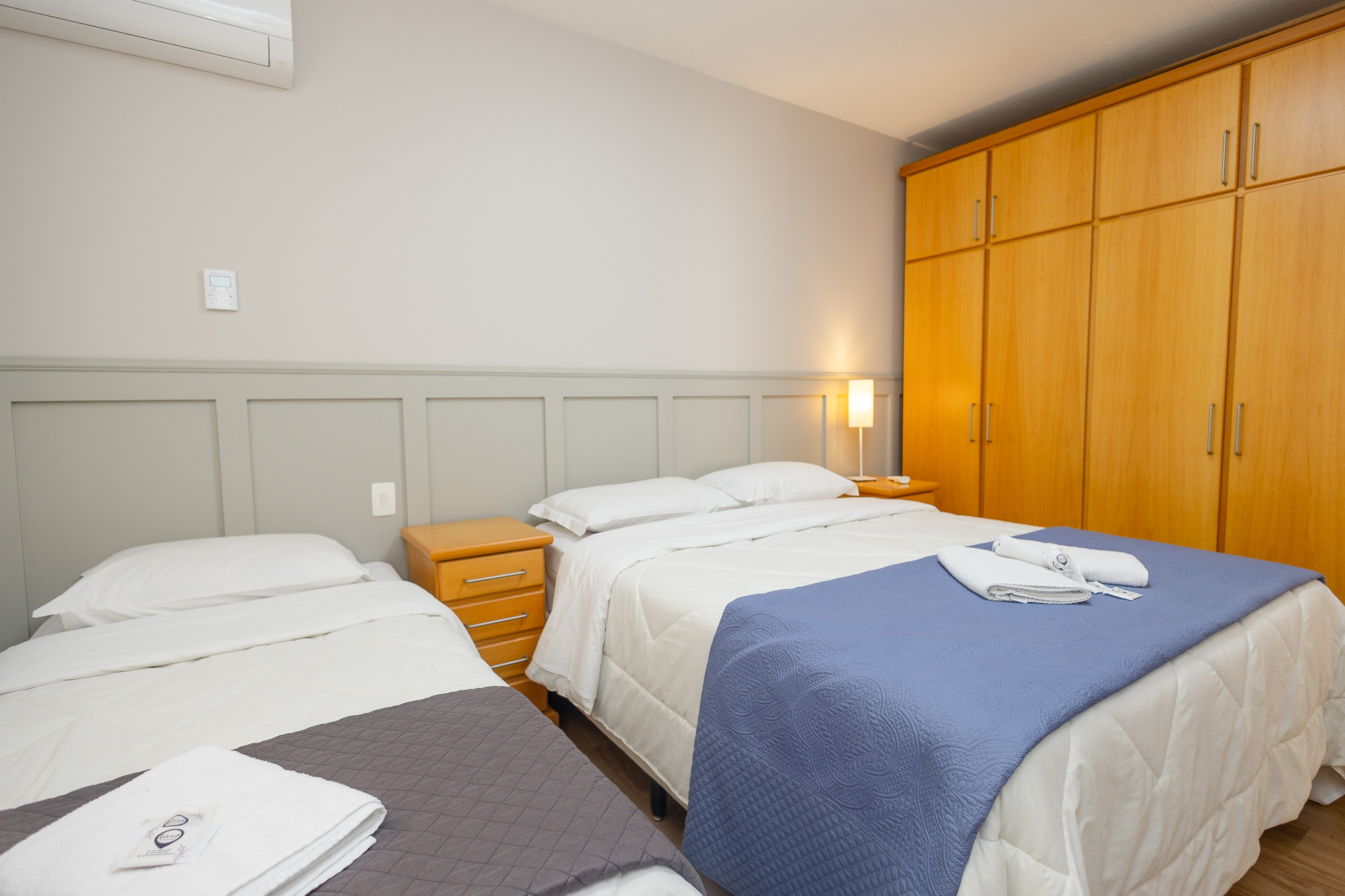 Acomoda até 06 pessoas em seus dois dormitórios, ambos climatizados com split Q/F: um quarto conta com cama queen e Smart TV e o outro, conta com uma cama queen e uma de solteiro. Ainda há espaço para um solteiro no sofá-cama da sala.