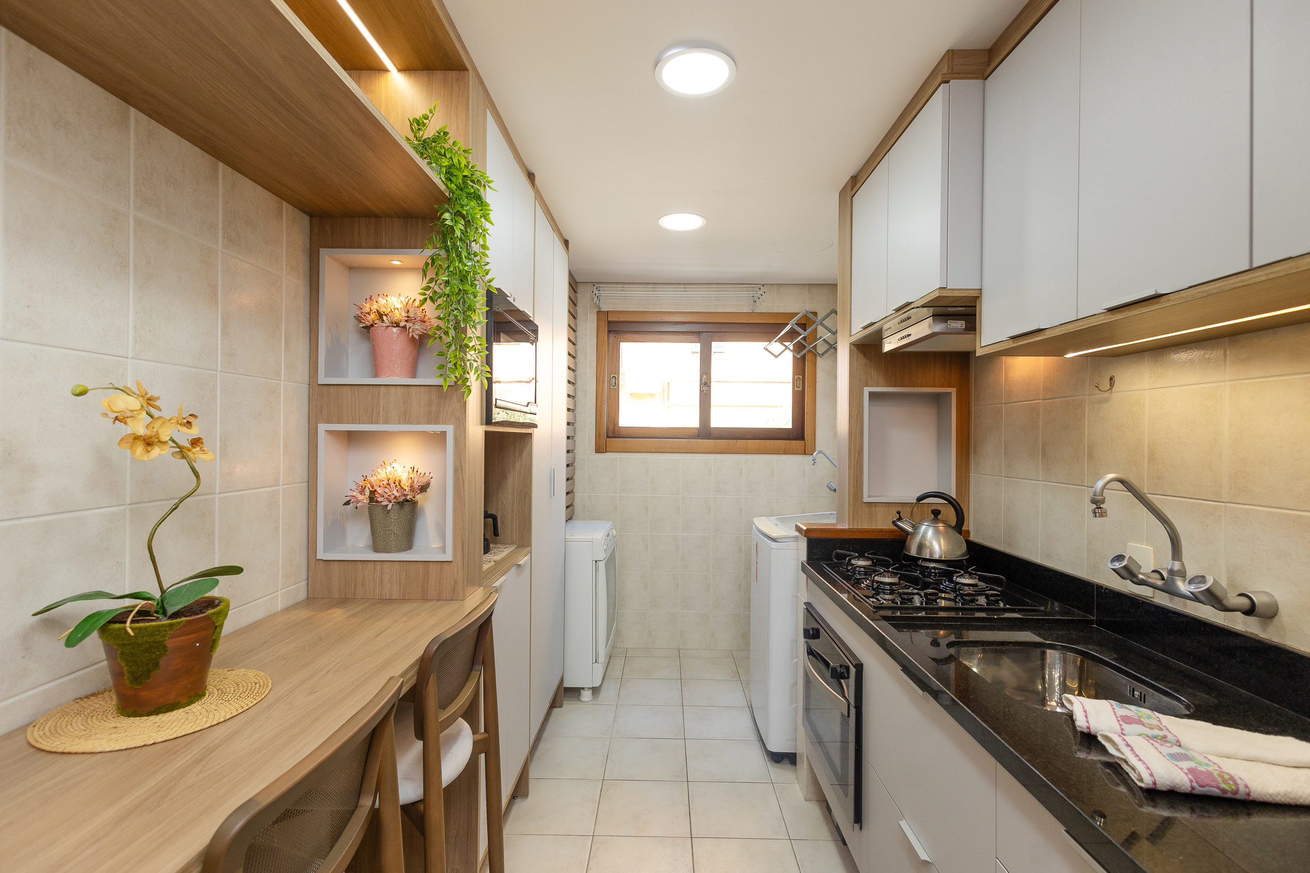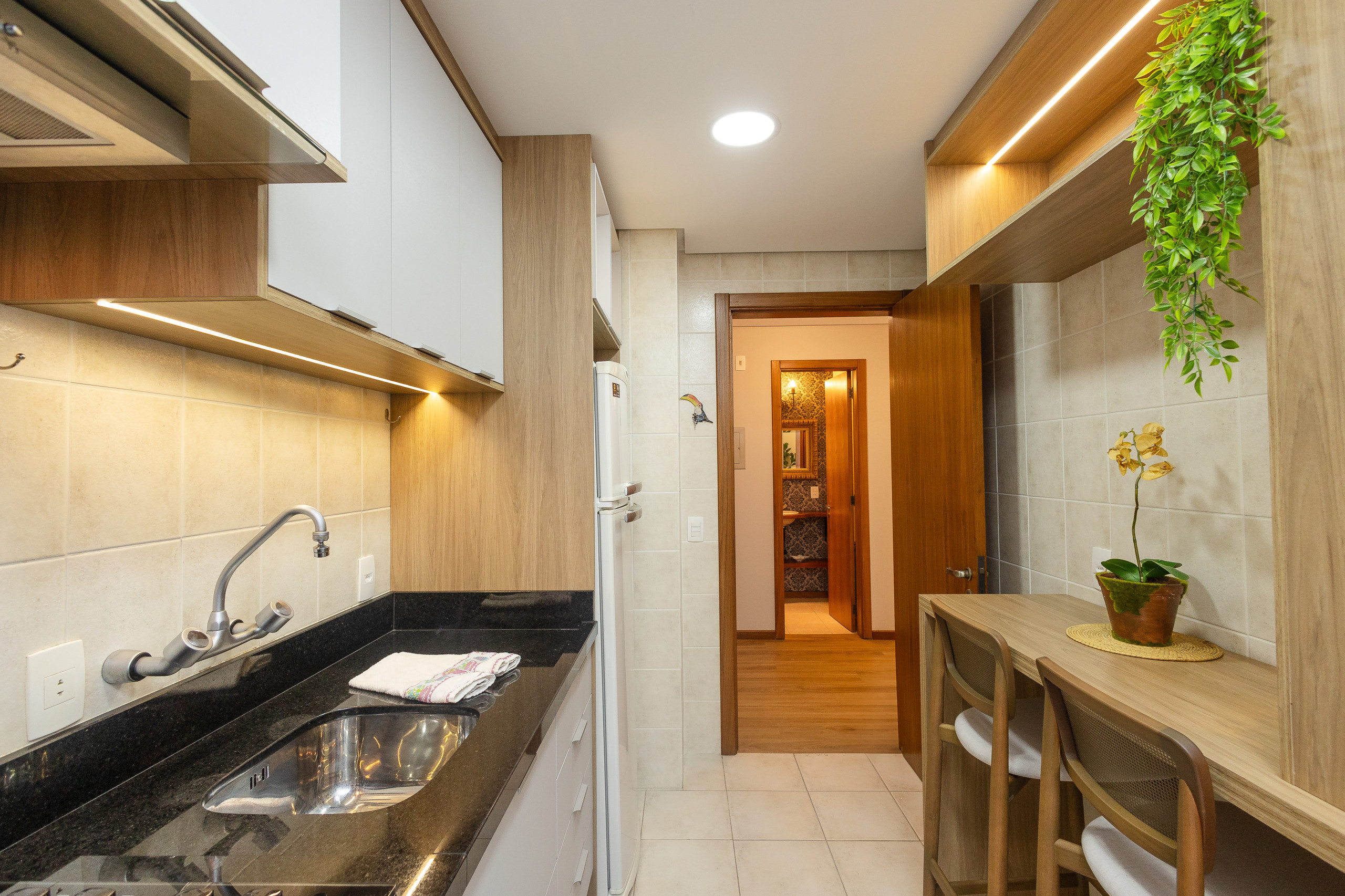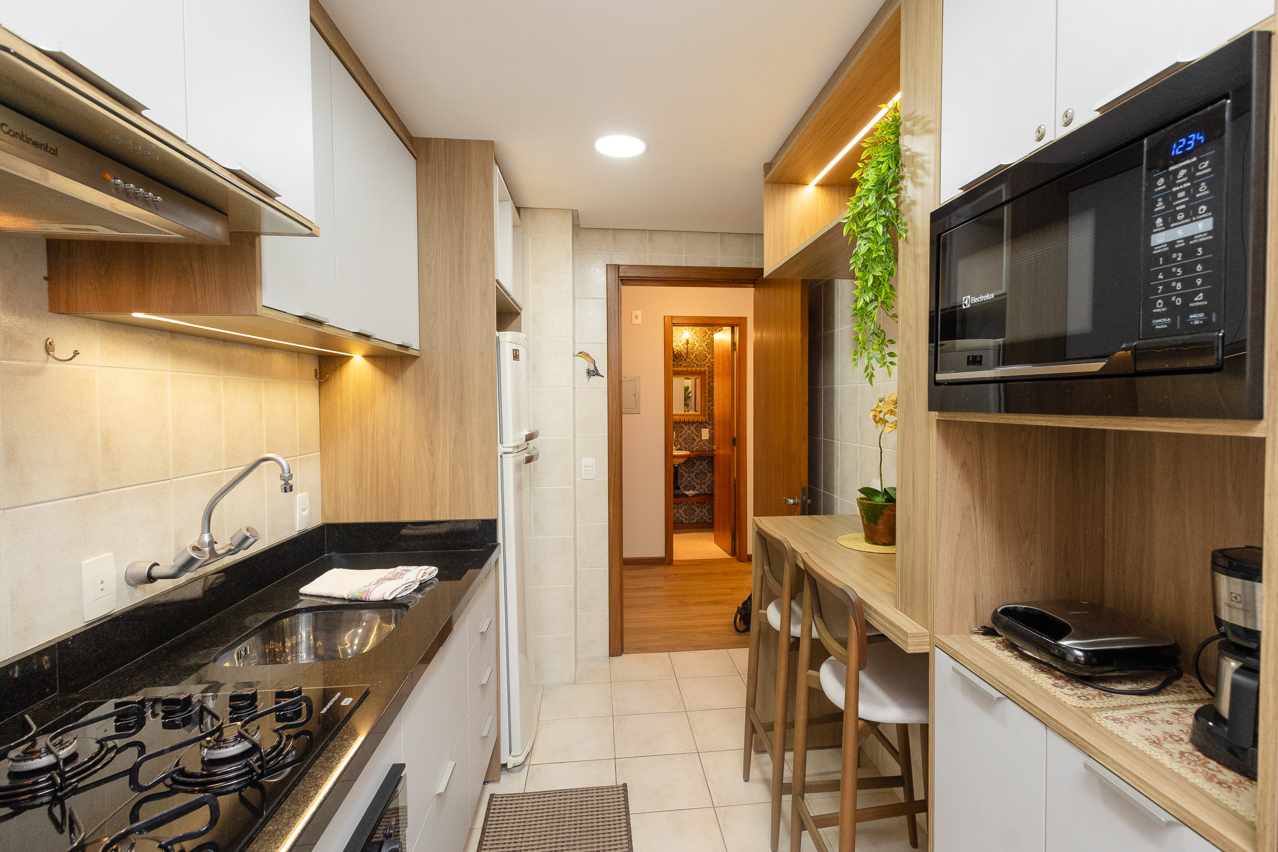 Na cozinha independente, você encontrará todos os eletrodomésticos necessários para preparar refeições deliciosas em família: geladeira, freezer, máquina de lavar, secadora, forno, micro-ondas, além de utensílios completos para tornar a culinária um momento de diversão. A cafeteira e o liquidificador são bônus extras para seus momentos de relaxamento.
