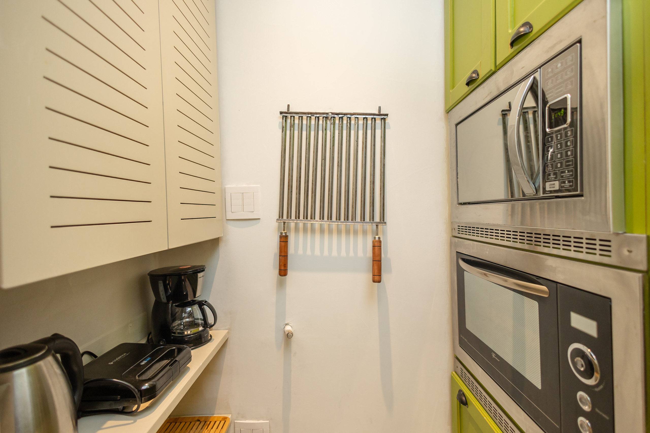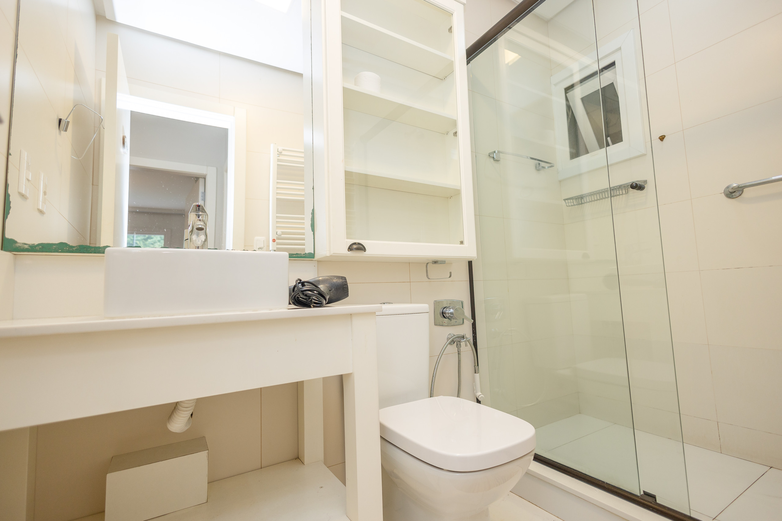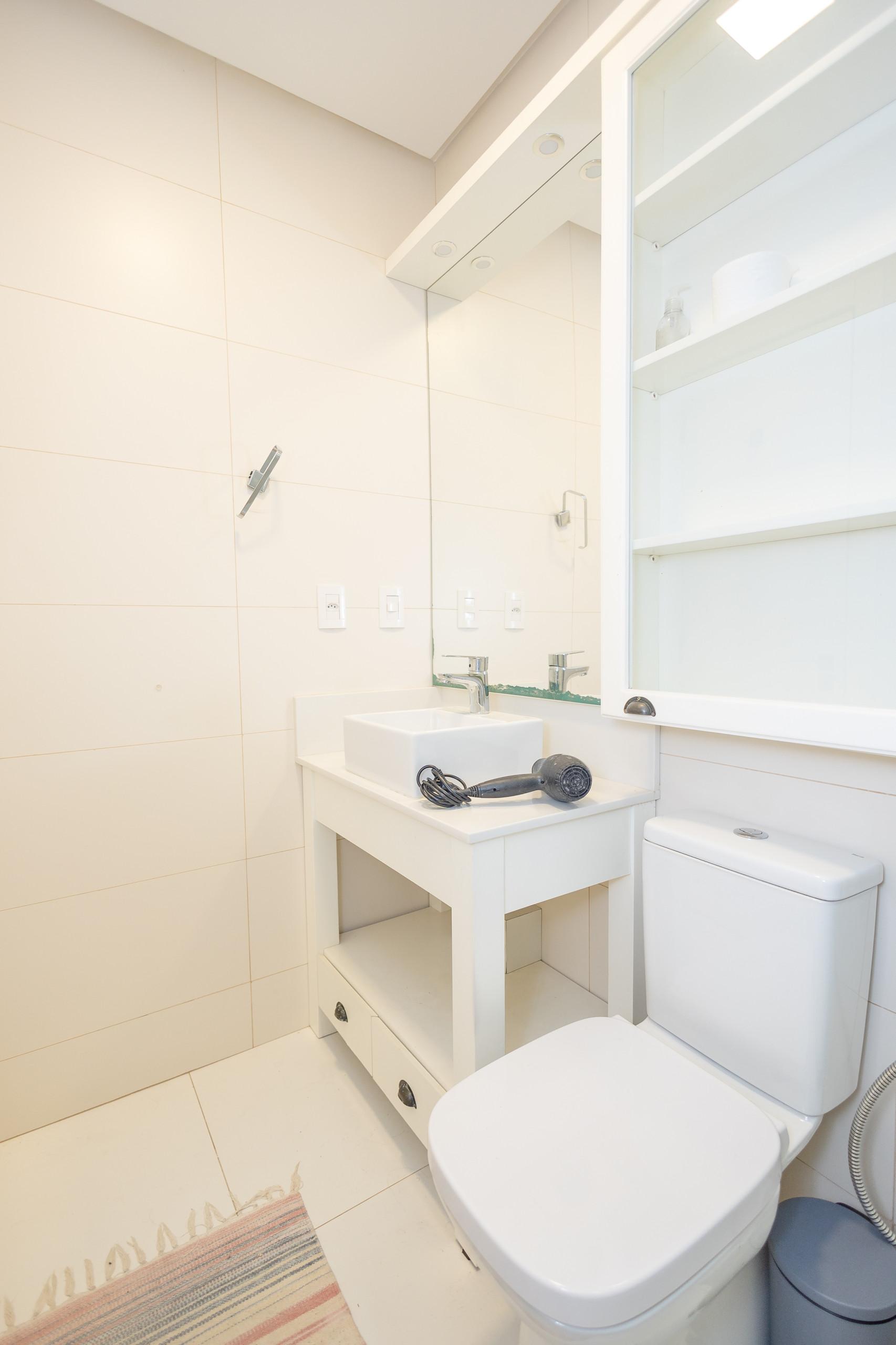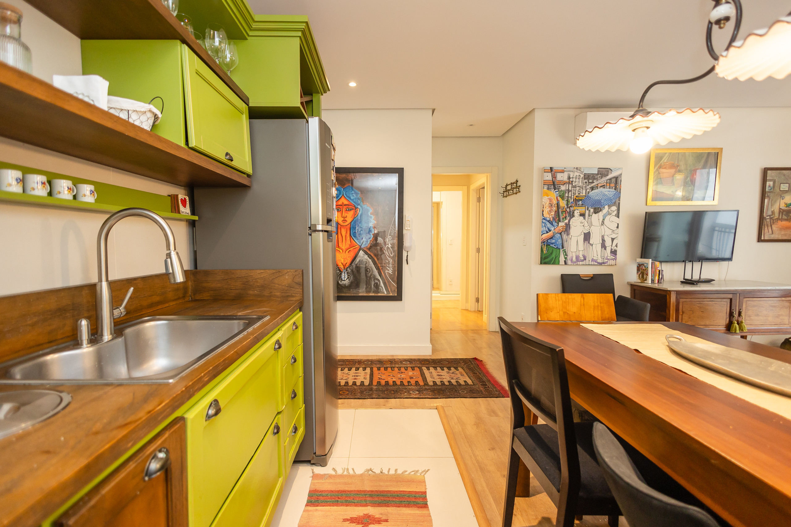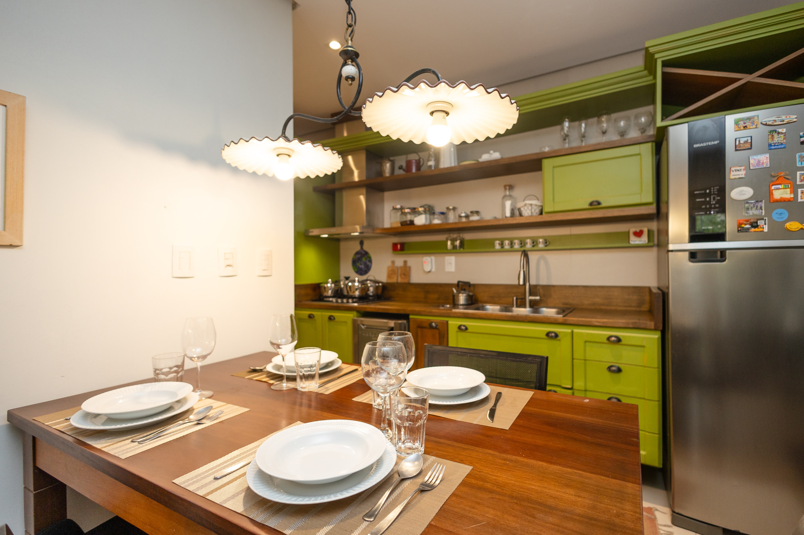 A cozinha completa conta com lava louças, churrasqueira, geladeira, cafeteira, sanduicheira, micro-ondas, cooktop e fogão. À mesa, poderão sentar-se até 04 hóspedes para refeições ou para simplesmente apreciar um chocolate quente ou um vinho. O apartamento ainda dispõe de secador de cabelos e lavanderia com lava e seca.