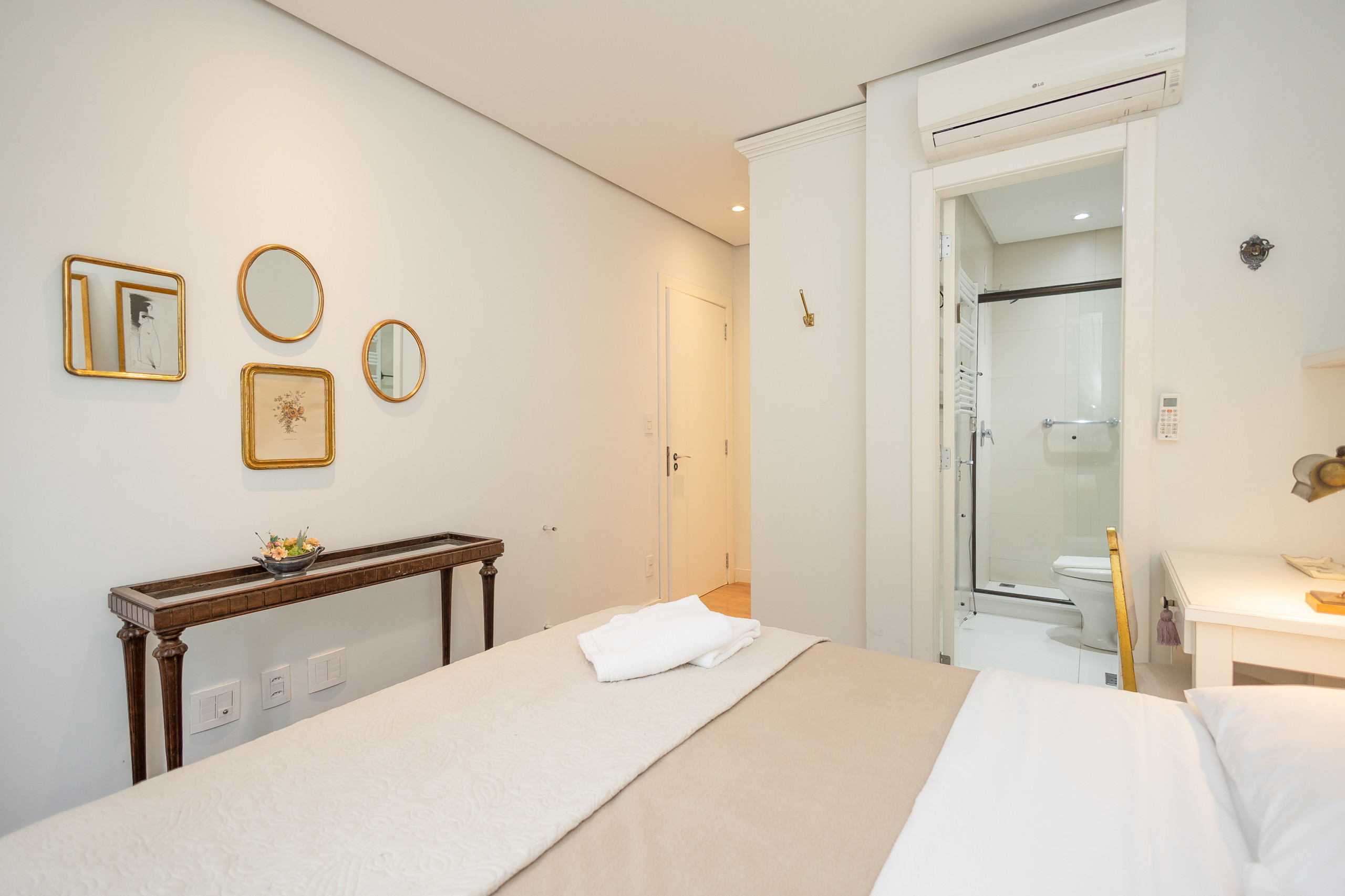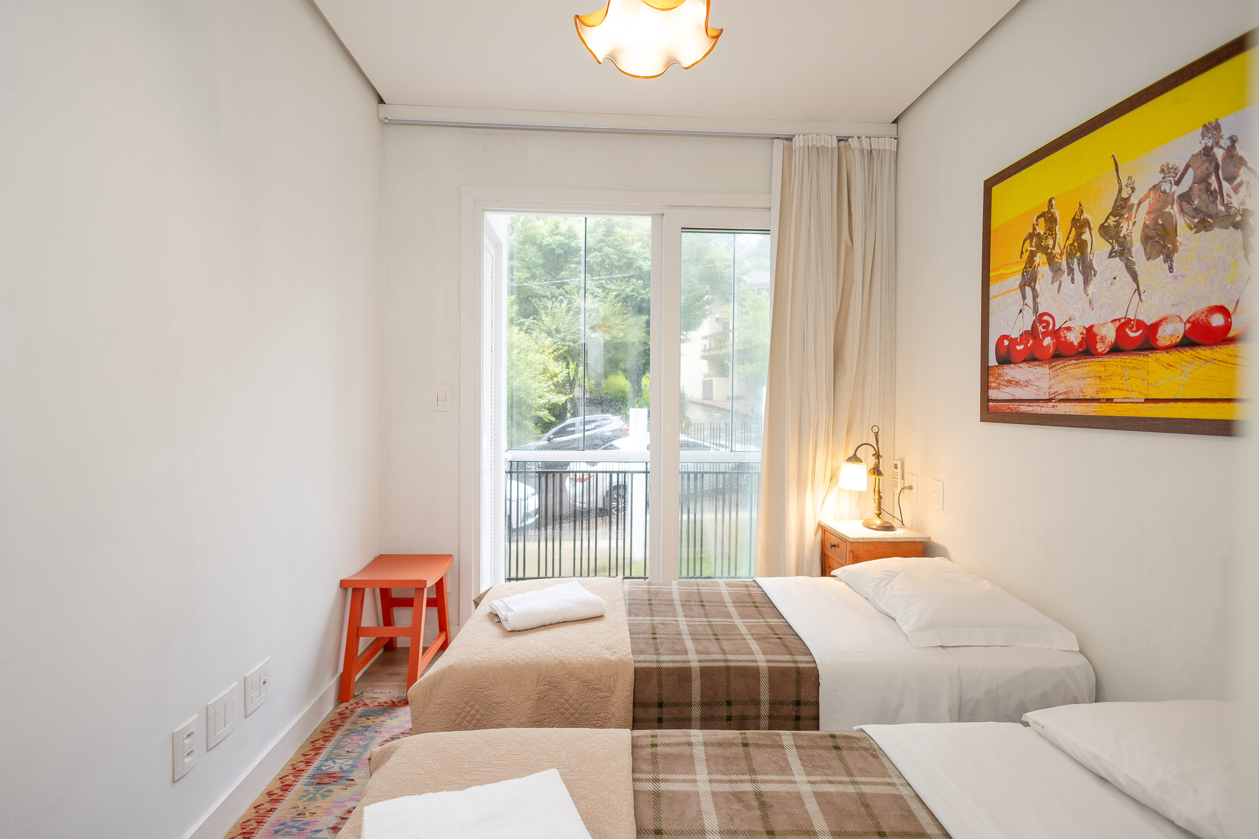 Na área íntima encontramos dois dormitórios, sendo uma suíte, e um banheiro social completo. Ambos dispõem de split Q/F e cortinas blackout que trazem aconchego. A suíte conta com cama queen e o outro dormitório dispõe de duas camas de solteiro que podem ser unidas formando uma cama queen também.