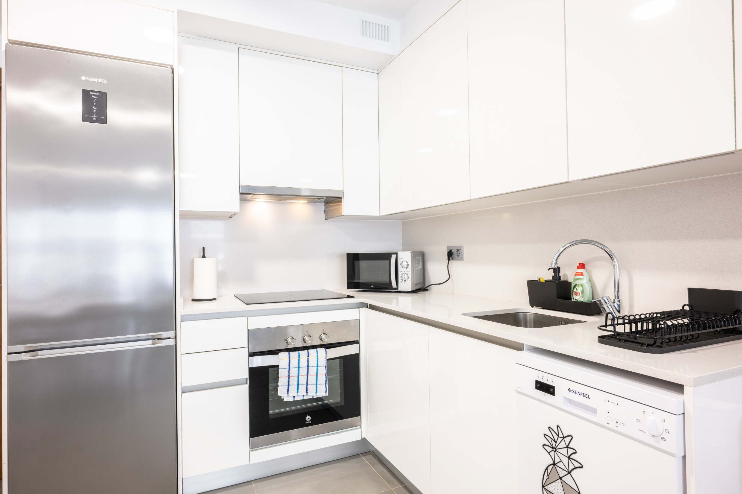 A cozinha americana, de indução, está equipada com geladeira, micro-ondas, forno, congelador, máquina de lavar louça, louça/talheres, utensílios/cozinha, cafeteira, fritadeira, torradeira, jarro elétrico e liquidificador.