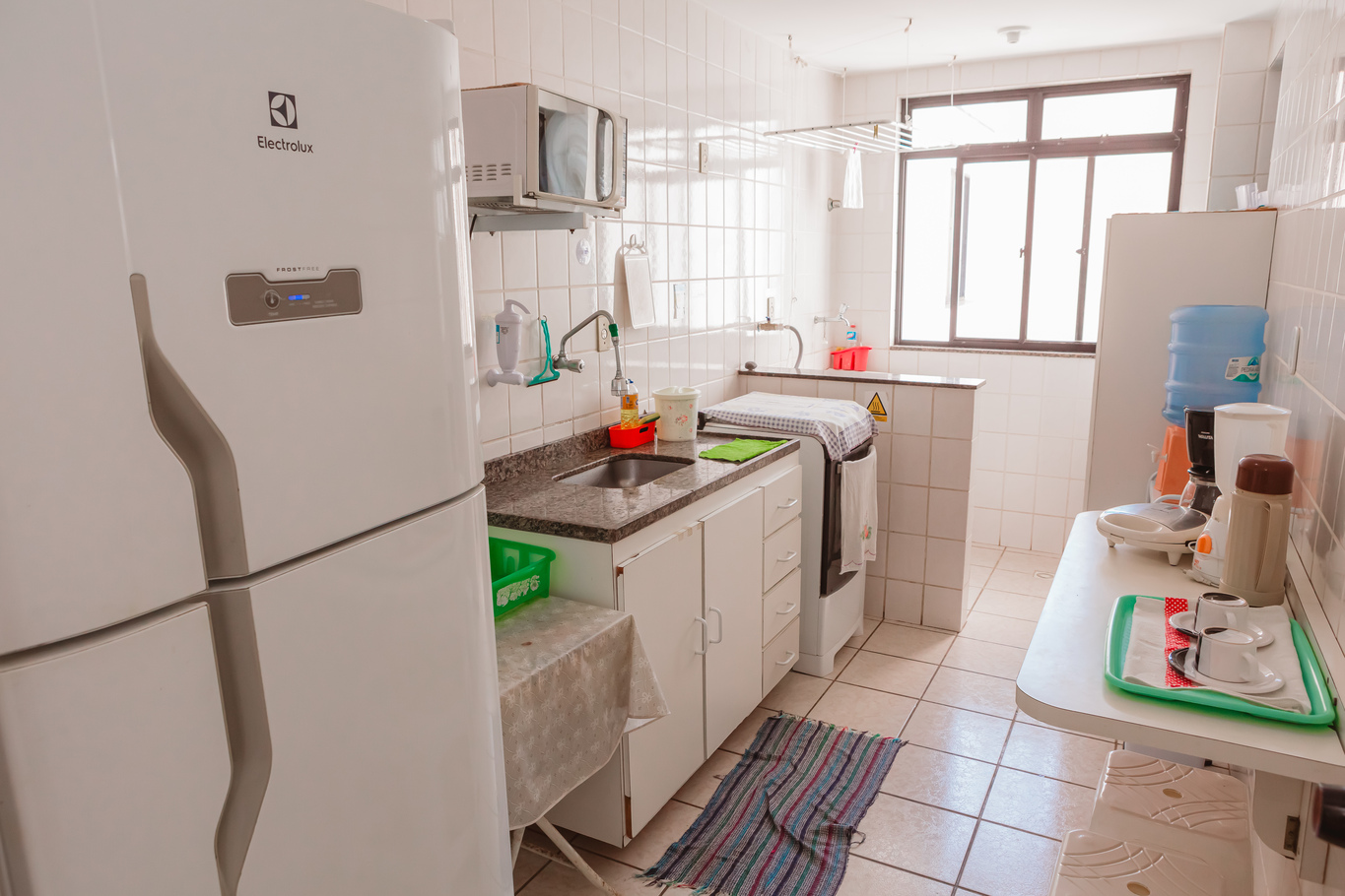 - A cozinha é equipada com diversos utensílios necessários para preparar deliciosos pratos, incluindo cafeteira, fogão, geladeira, liquidificador, microondas e torradeira