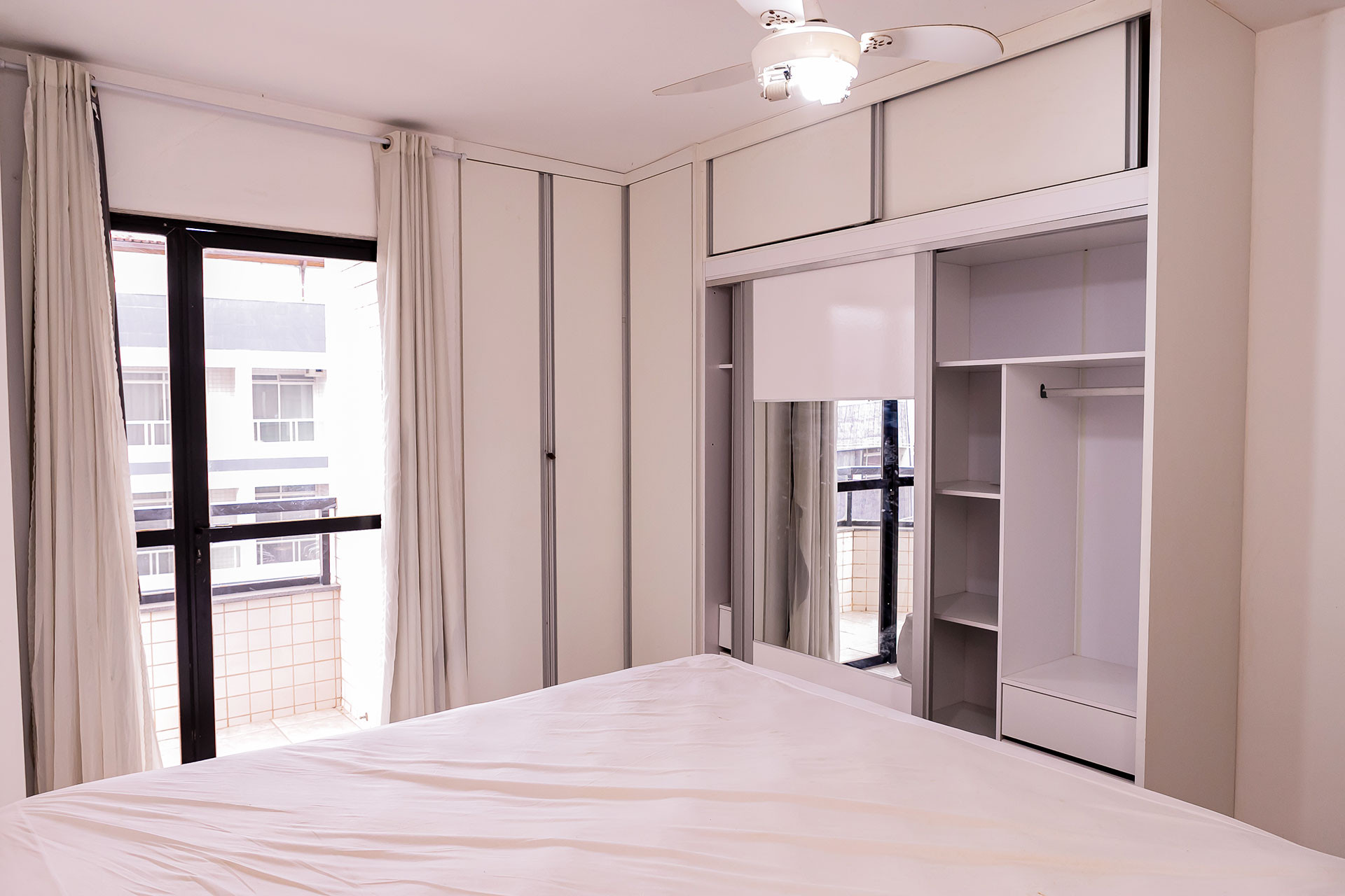 - Na suíte há 1 cama king size, armário espelhado e sacada com vista do mar