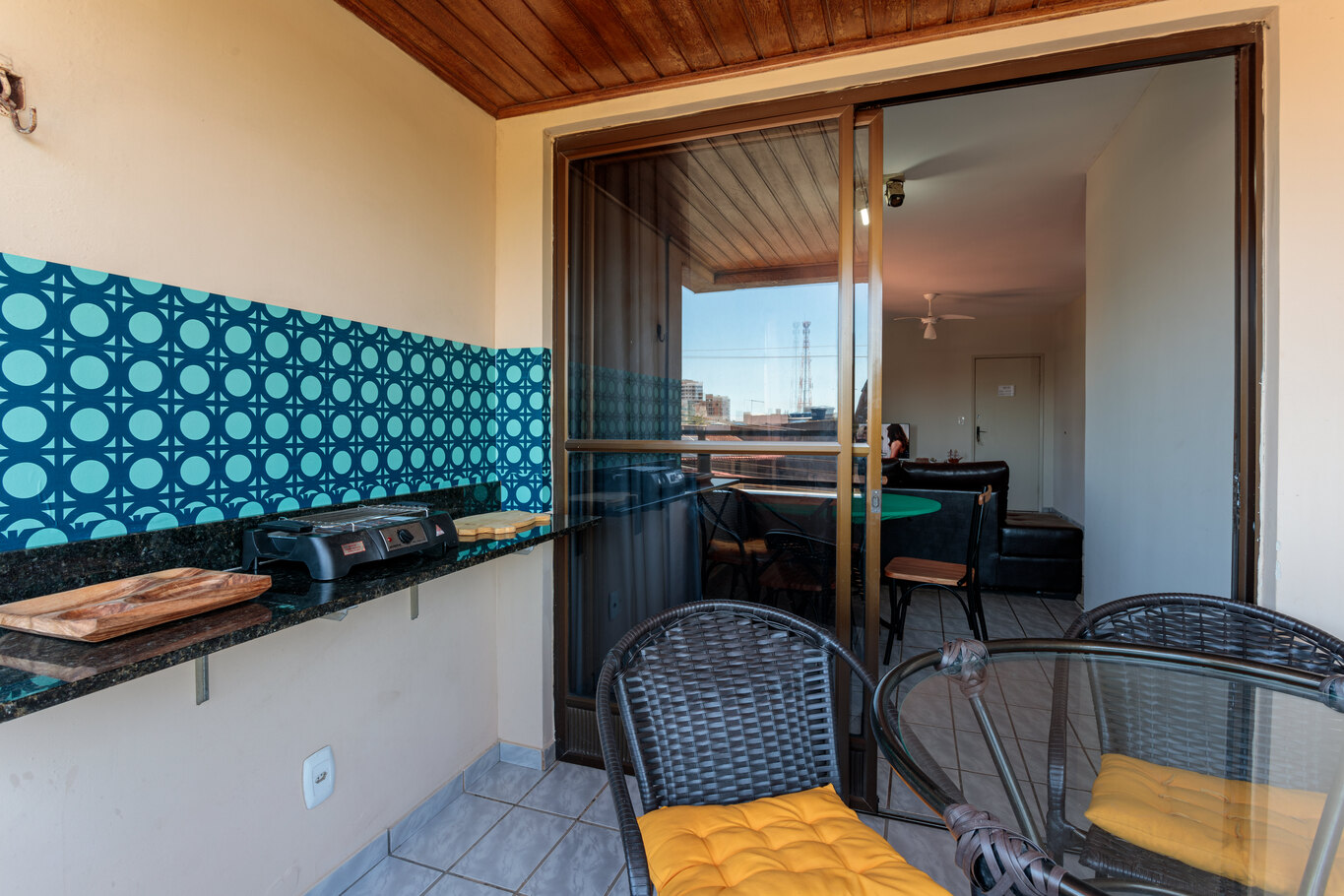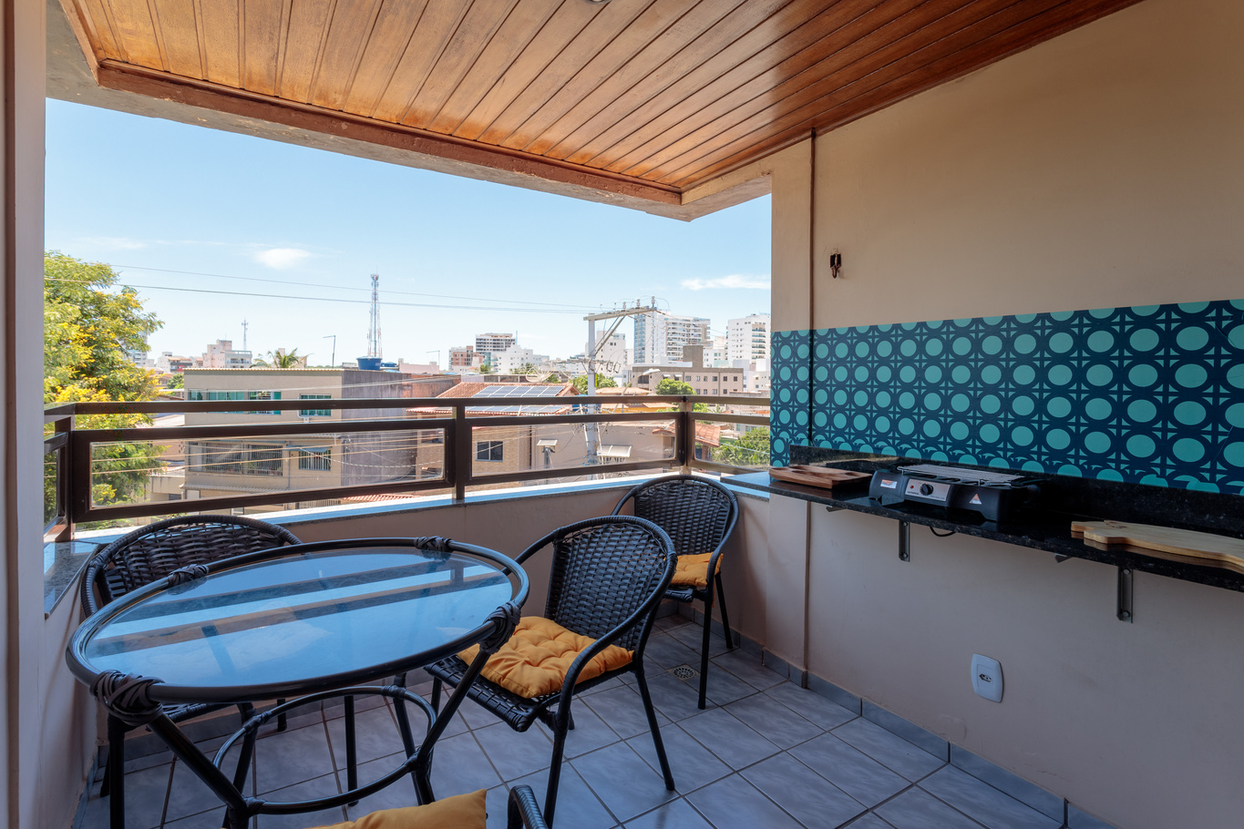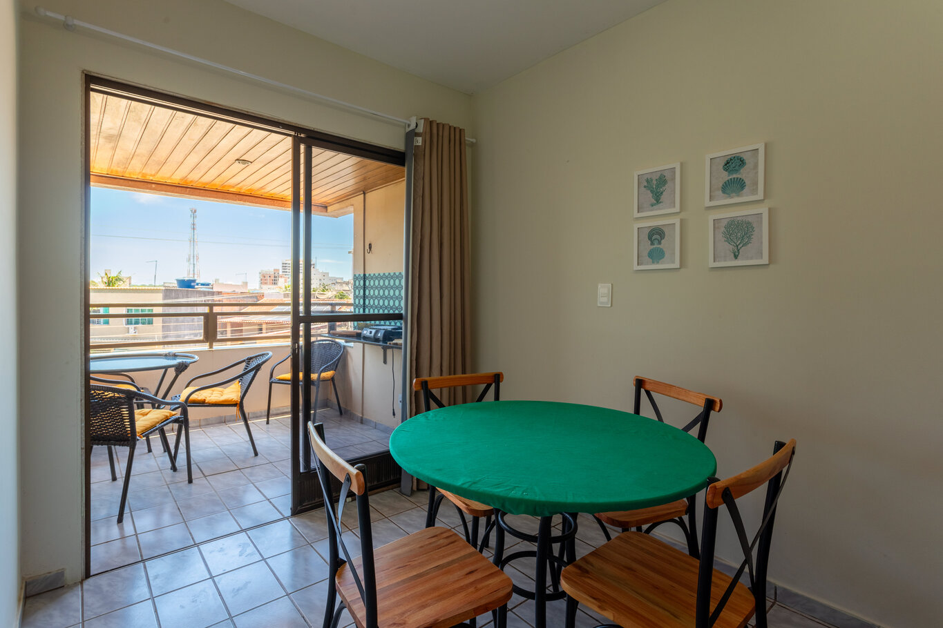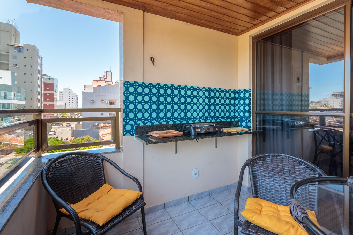 - Varanda com vista para a rua, com móveis externos