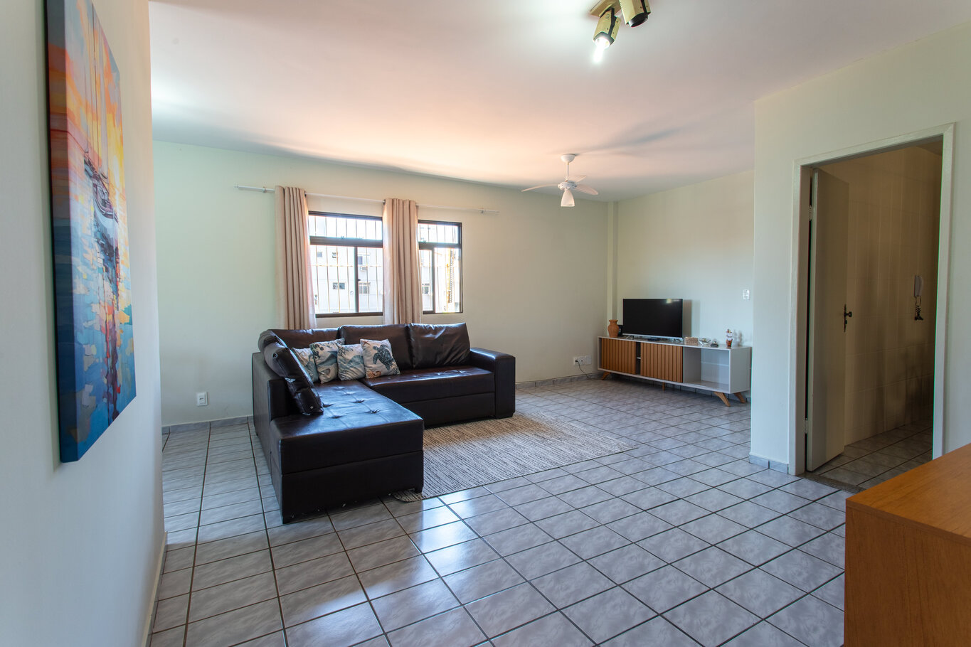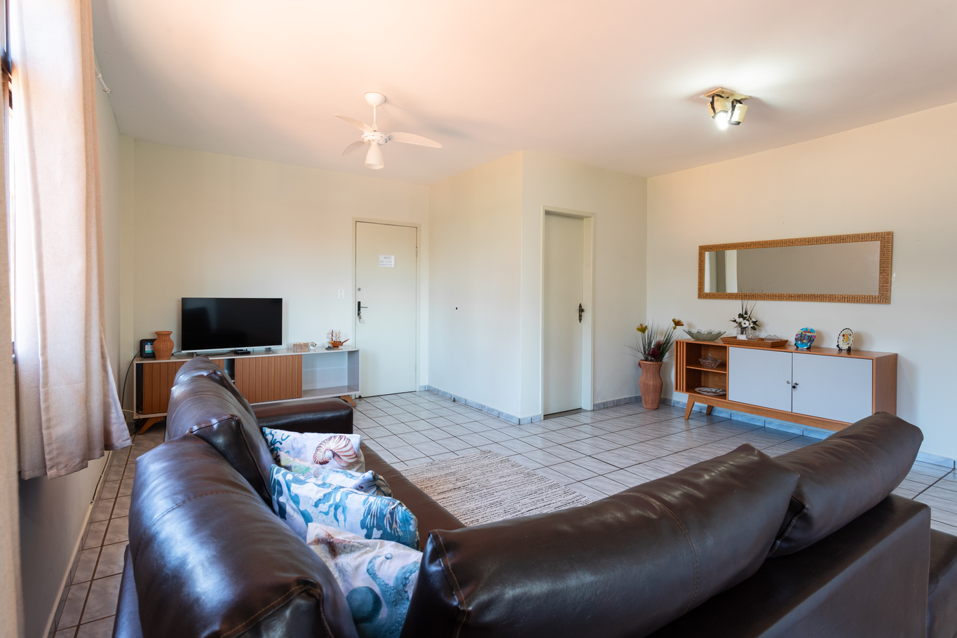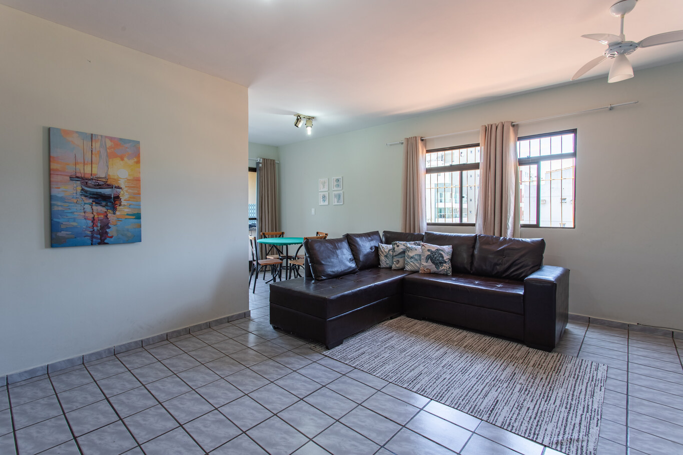 - A sala está equipada com sofá confortável, poltrona, cadeira e ventilador de teto