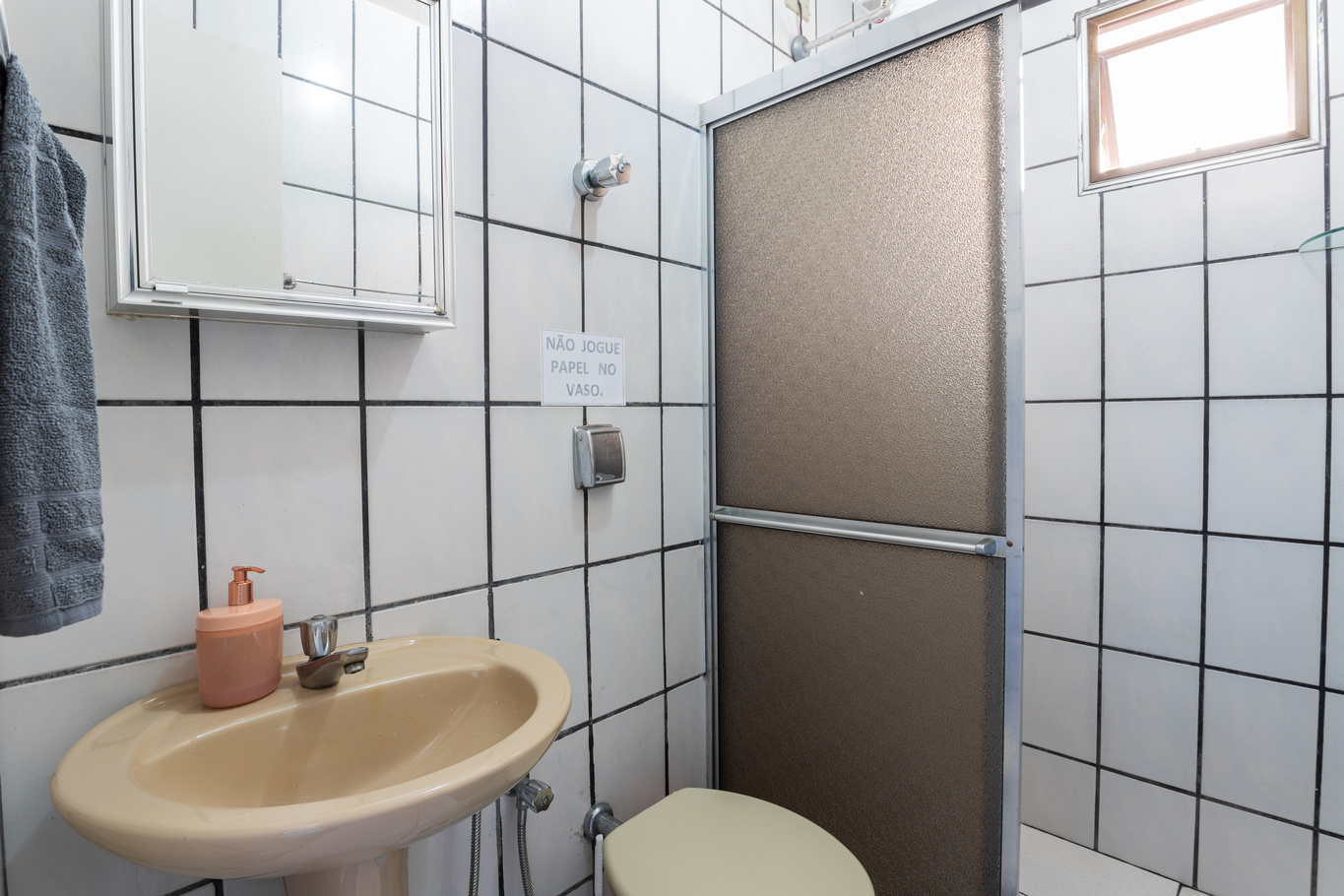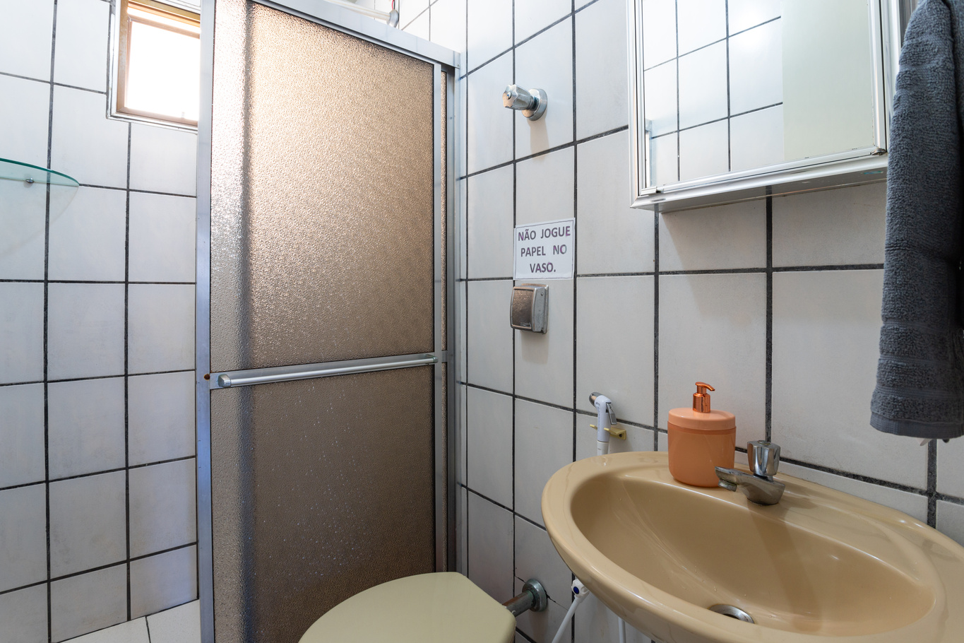 - O banheiro social possui chuveiro elétrico e box de acrílico