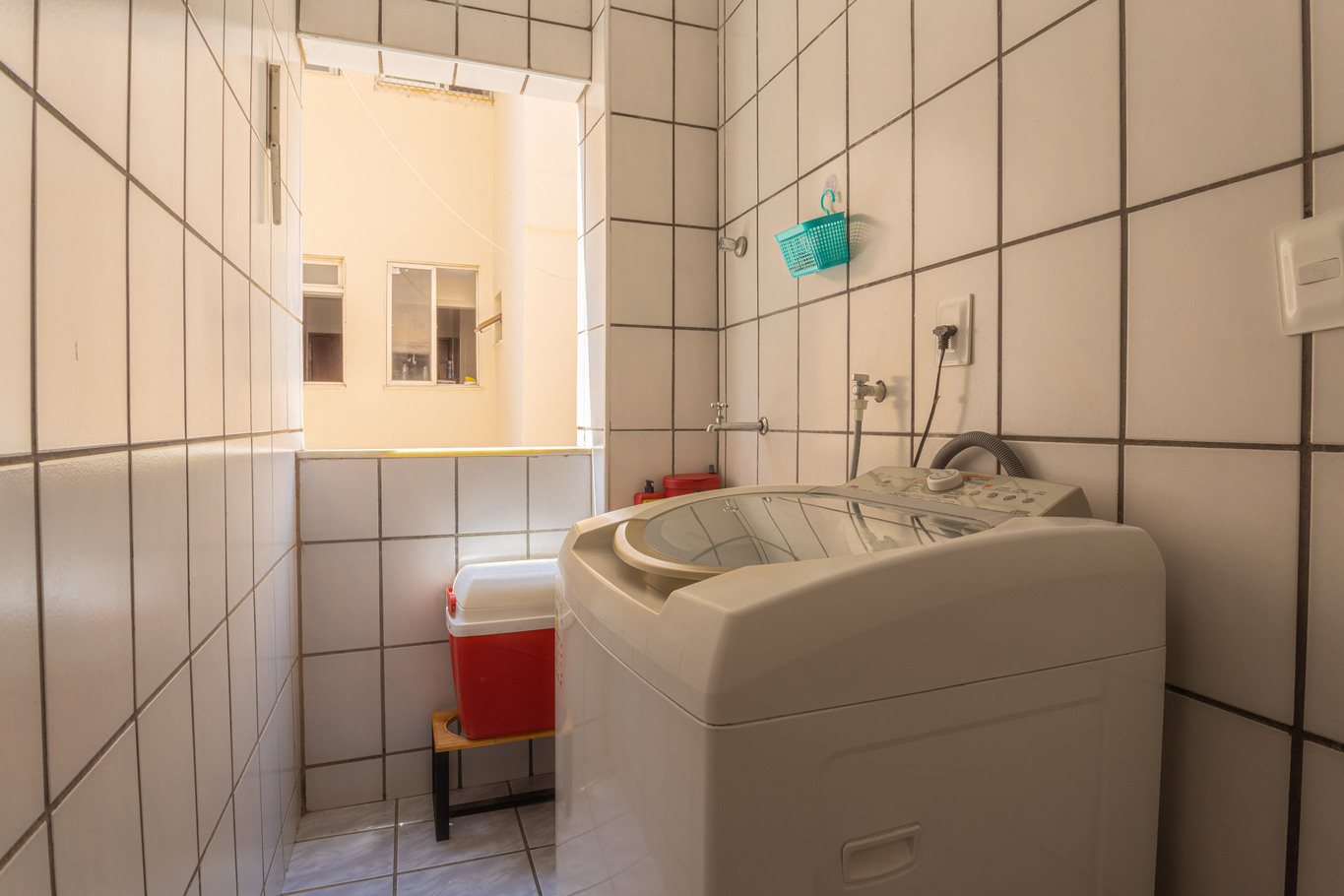 - Lavanderia com máquina de lavar roupa, ferro e tábua de passar