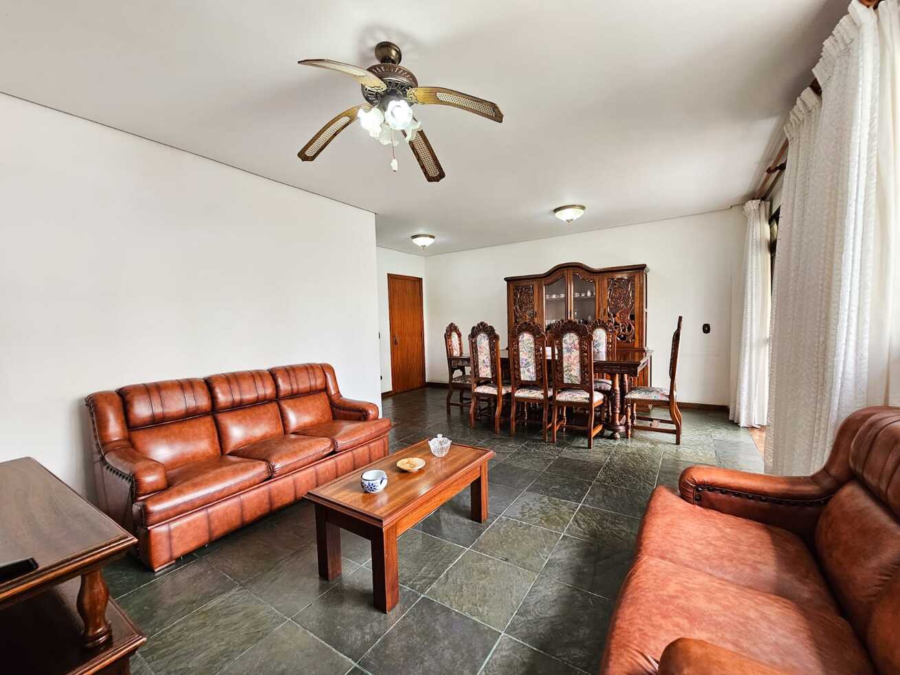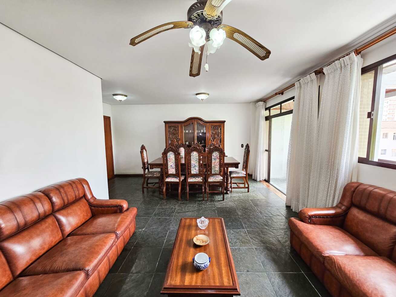 - A sala está equipada com cadeira, mesa de centro, sofá e ventilador de teto