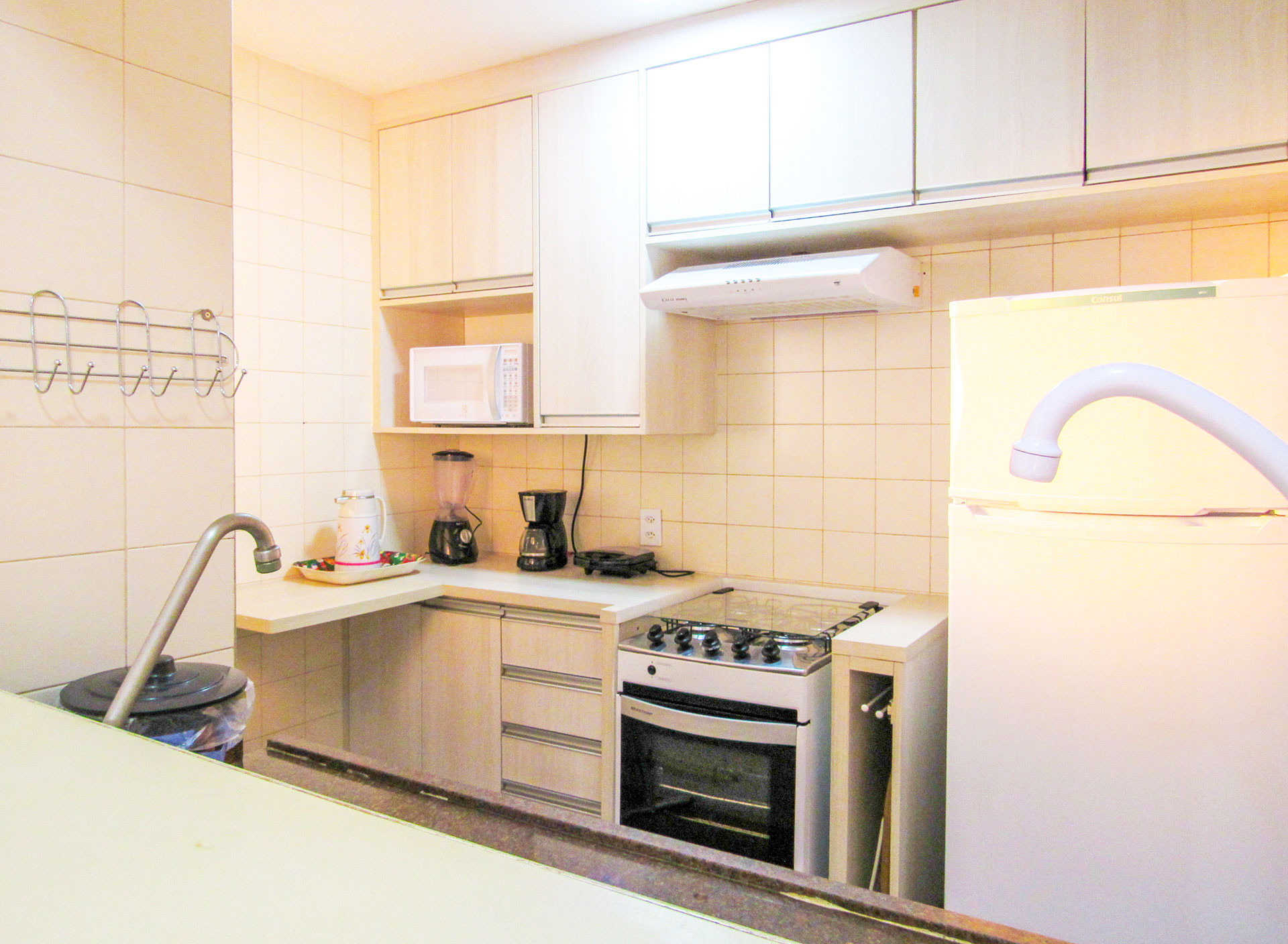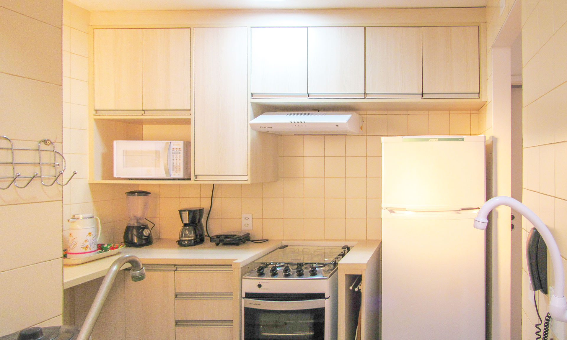 - Altamente equipada, a cozinha possui diversos utensílios necessários para preparar suas refeições, incluindo cafeteira, fogão, geladeira, liquidificador, micro-ondas e sanduicheira