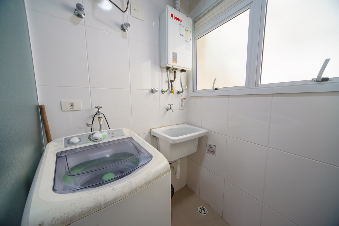 - Lavanderia com máquina de lavar roupa, ferro e tábua de passar