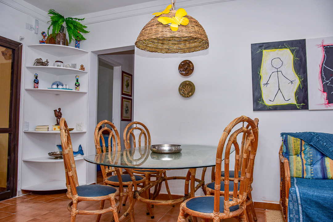 - A sala é bem confortável, nela você encontra cadeiras, mesa de centro, poltrona e ventilador de teto