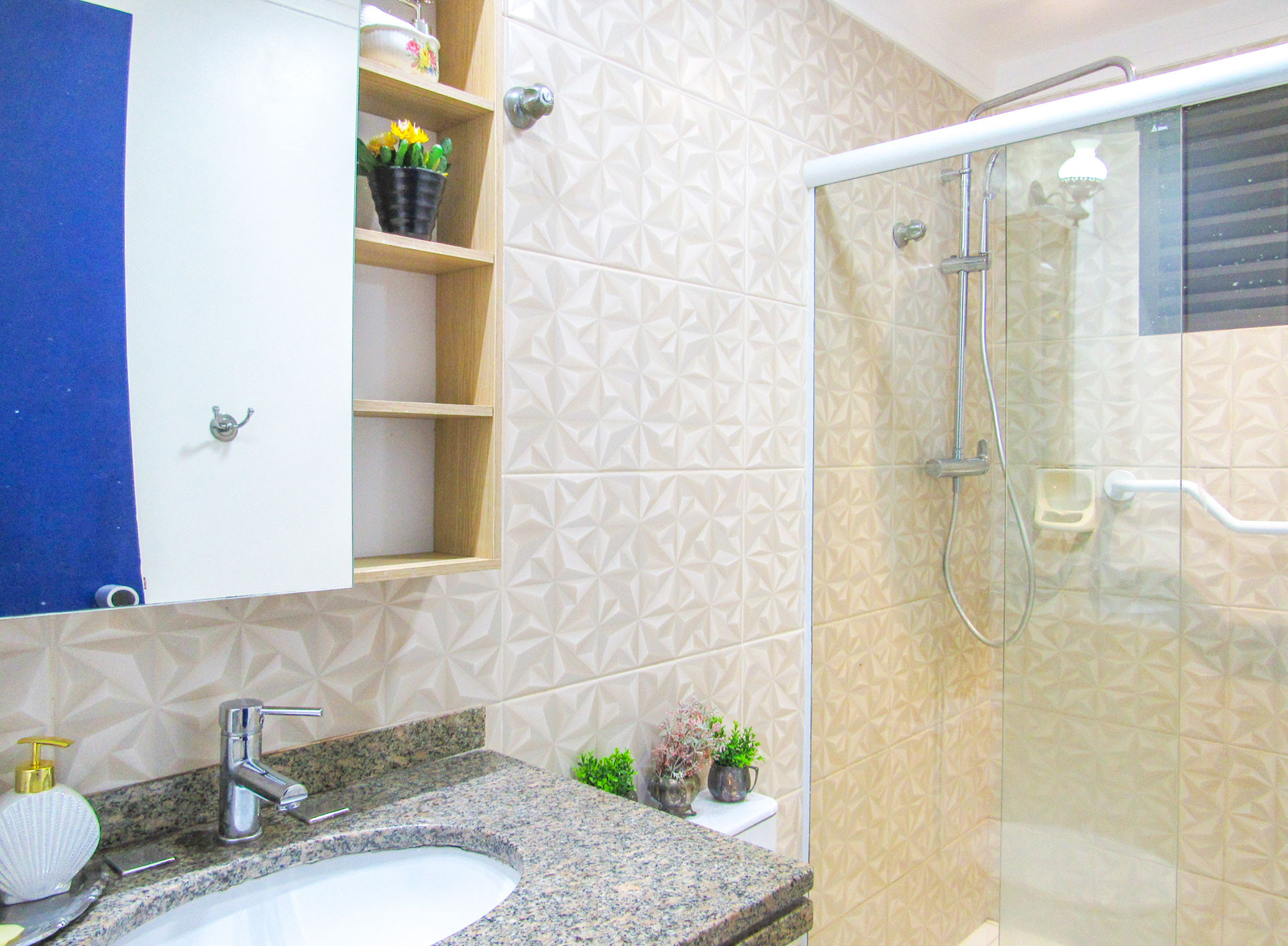 - O banheiro dispõe de chuveiro com aquecimento, box de vidro, armário e espelho