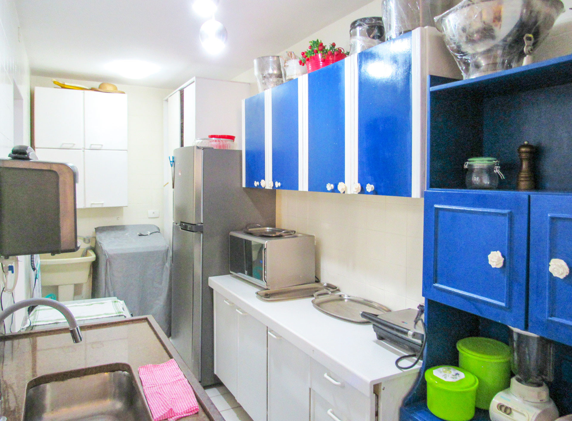 - Na cozinha americana você encontrará fogão, geladeira, micro-ondas, liquidificador, fritadeira elétrica, cafeteira elétrica, panela de pressão elétrica, grill, filtro de água de parede, panelas, louças e utensílios variados