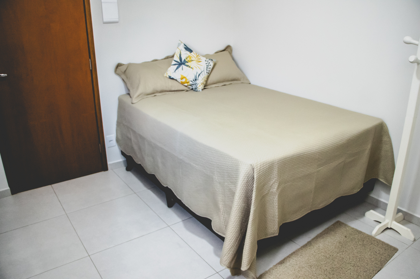 - No quarto há 1 cama de casal, armário, cobertor e protetor de colchão