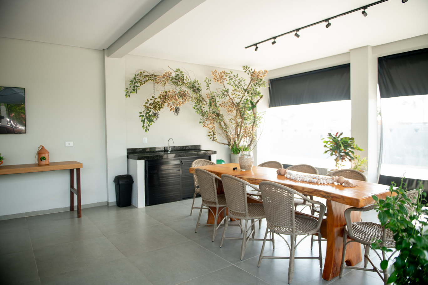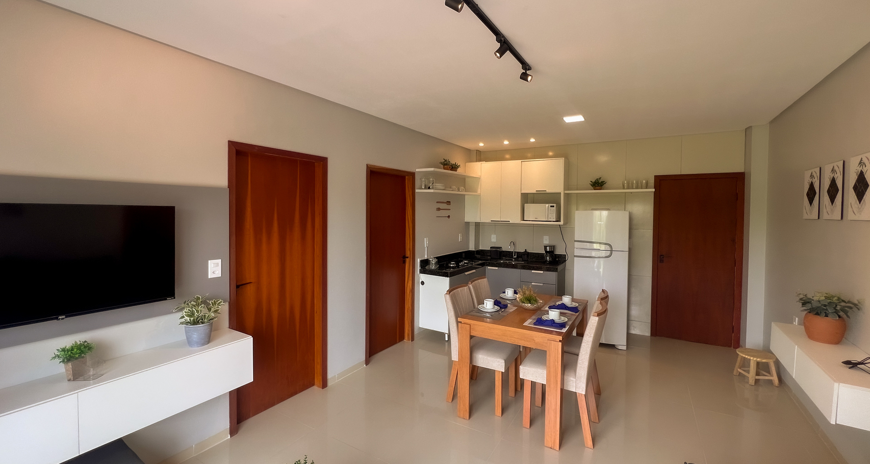 - Sala integrada à cozinha com sofá, Smart TV e mesa de refeições