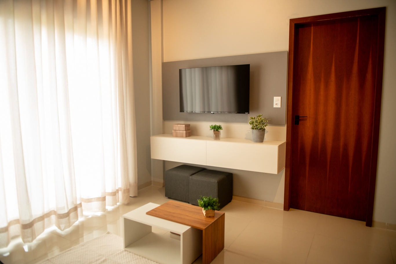- Sala integrada à cozinha com sofá, Smart TV e varanda