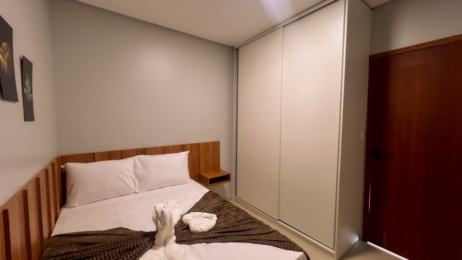 - Quarto 1 (suíte): cama queen, ar-condicionado e banheiro com box de vidro